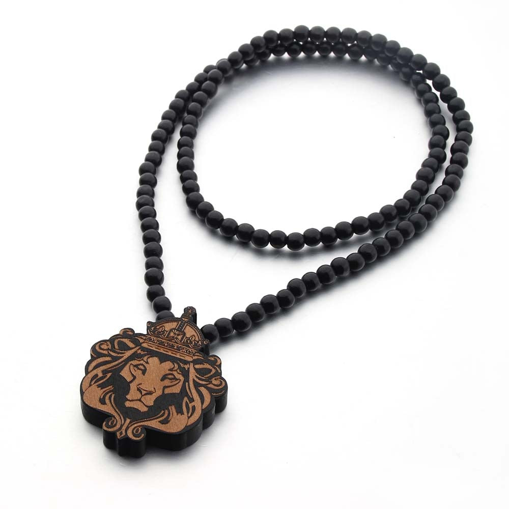VOQ Hiphop Rock The Lion King Pendant Long Necklace for Men Wood Beads Sweater Chains Original Jewerly Party Gifts