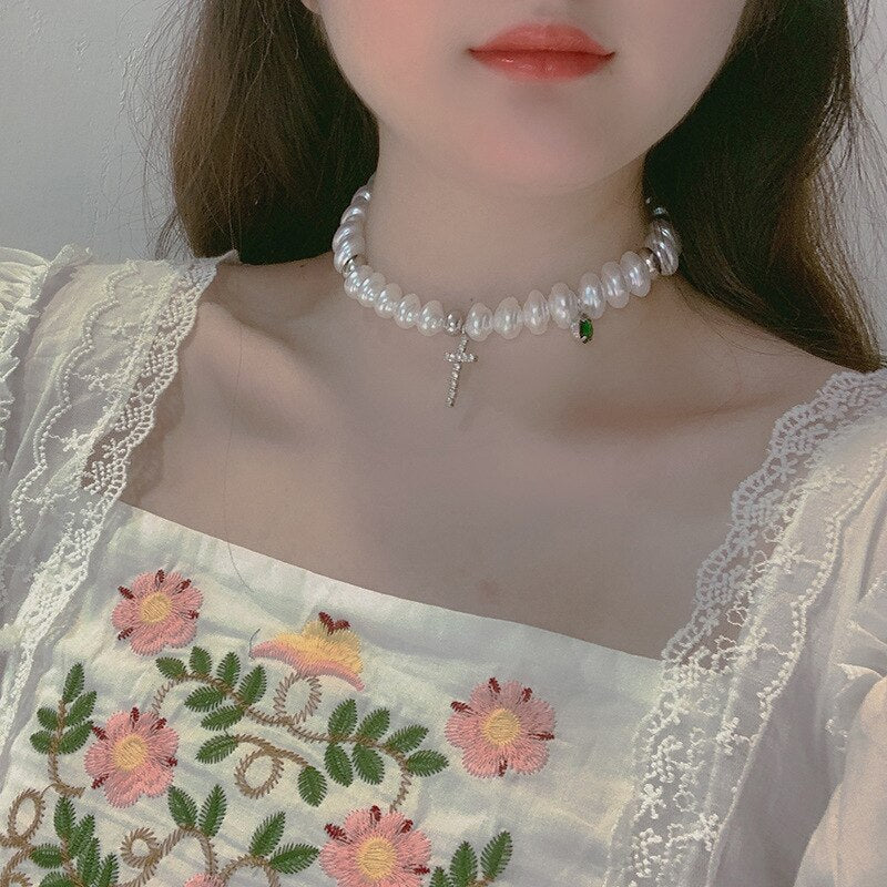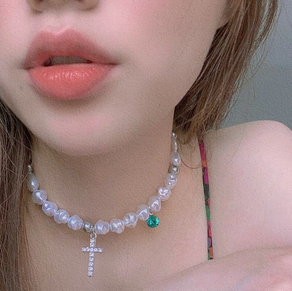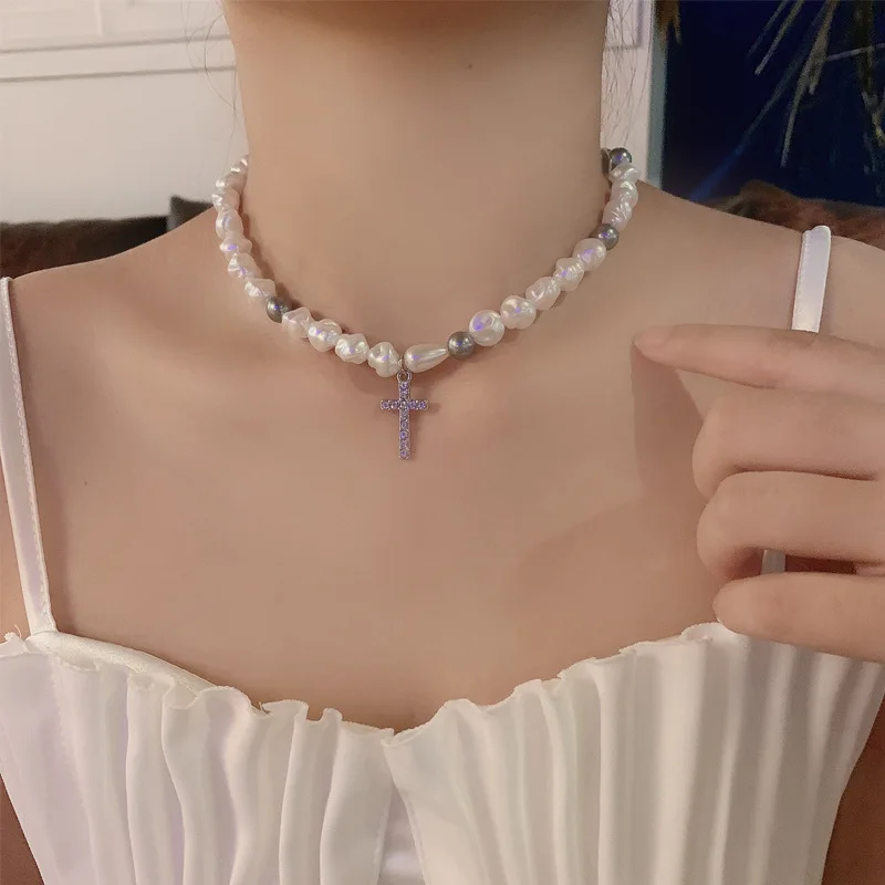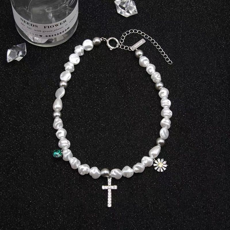 White Irregular Simulated Pearl Necklace Jewelry Rhinestone Cross Crystal Pendant Classic Necklace For Women Choker Necklace