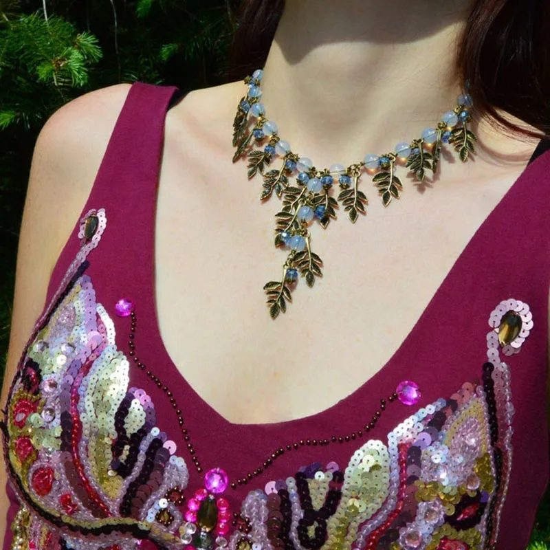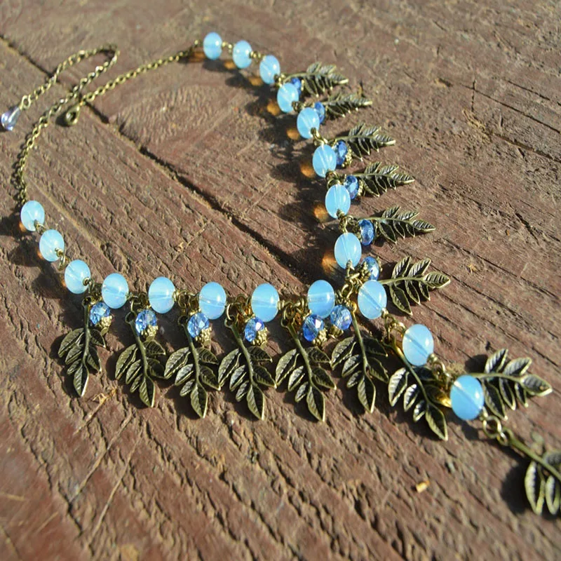 Witchy opalite necklace, elven opalite pendant, elvish leaf necklace, elf witch necklace, forest goth dark mori jewelry