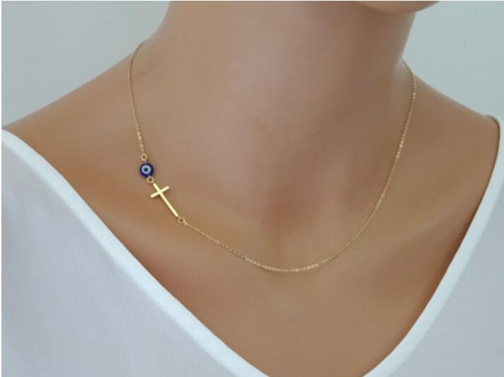 Women Sideways Gold Simple Cross Pendant Necklace Eyes Skinny Cross Celebrity Inspired Chain Necklace Bijoux Collar Jewelry