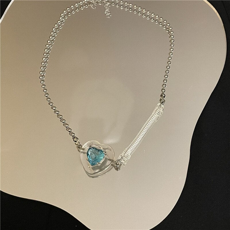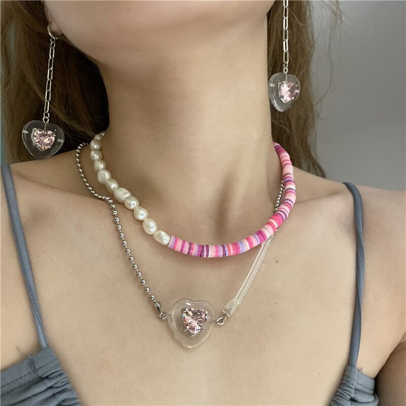Women's Bohemia Style Acrylic Neck Chain Splicing Pearls Chokers Exquisite Heart Pendant Necklace Jewelry Inlaid with Zirconia