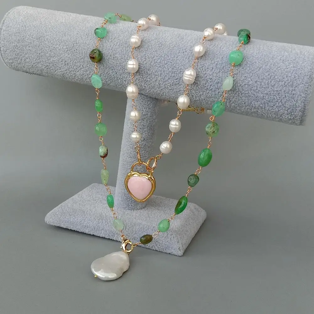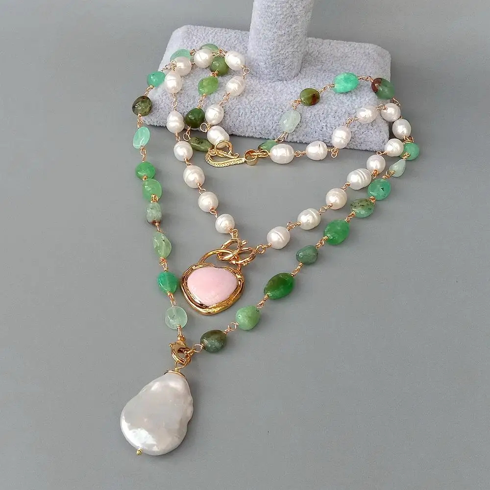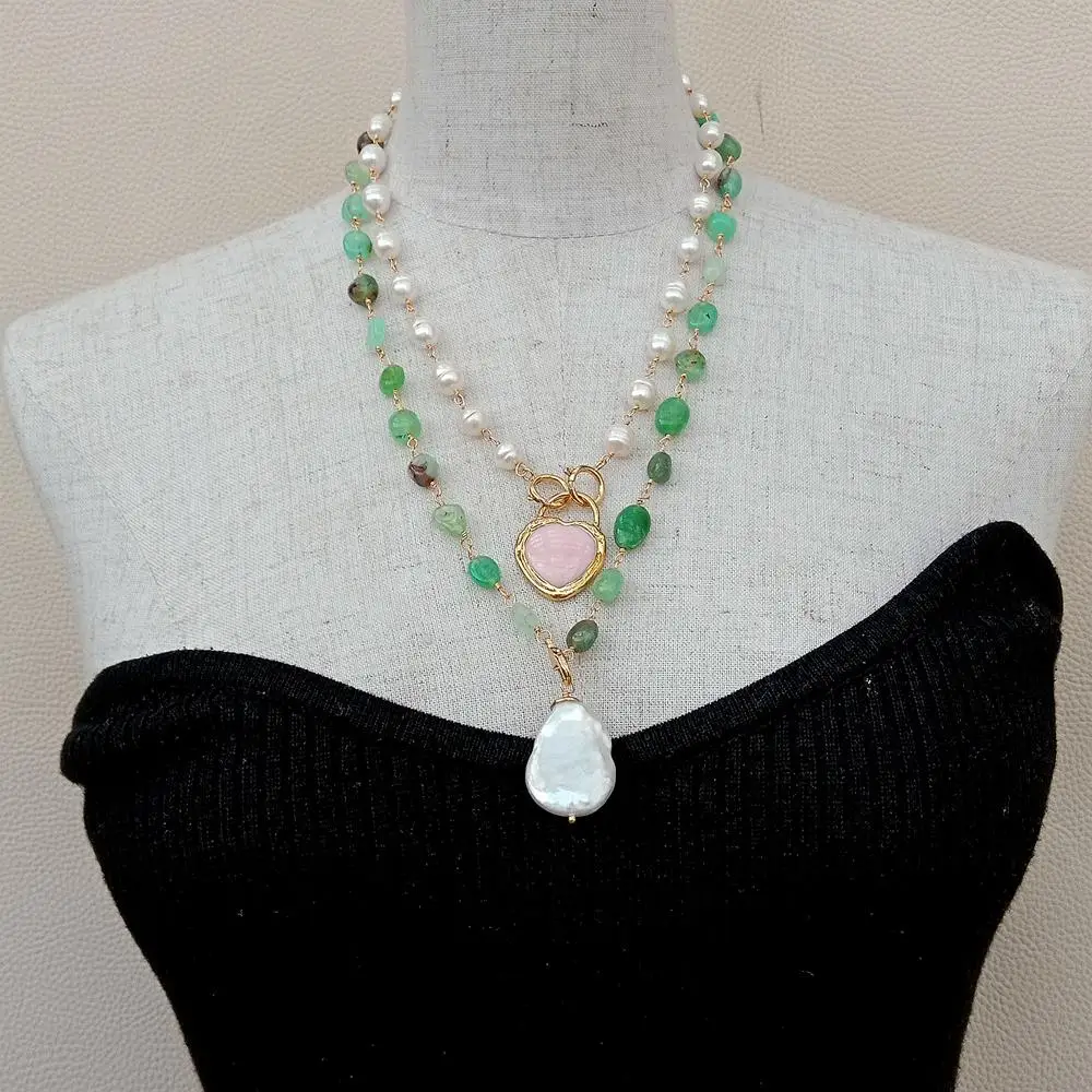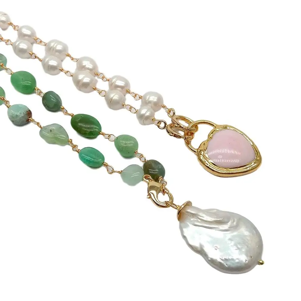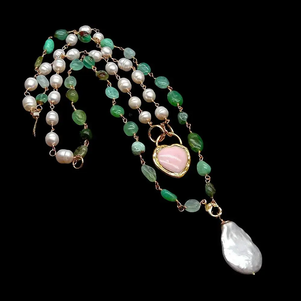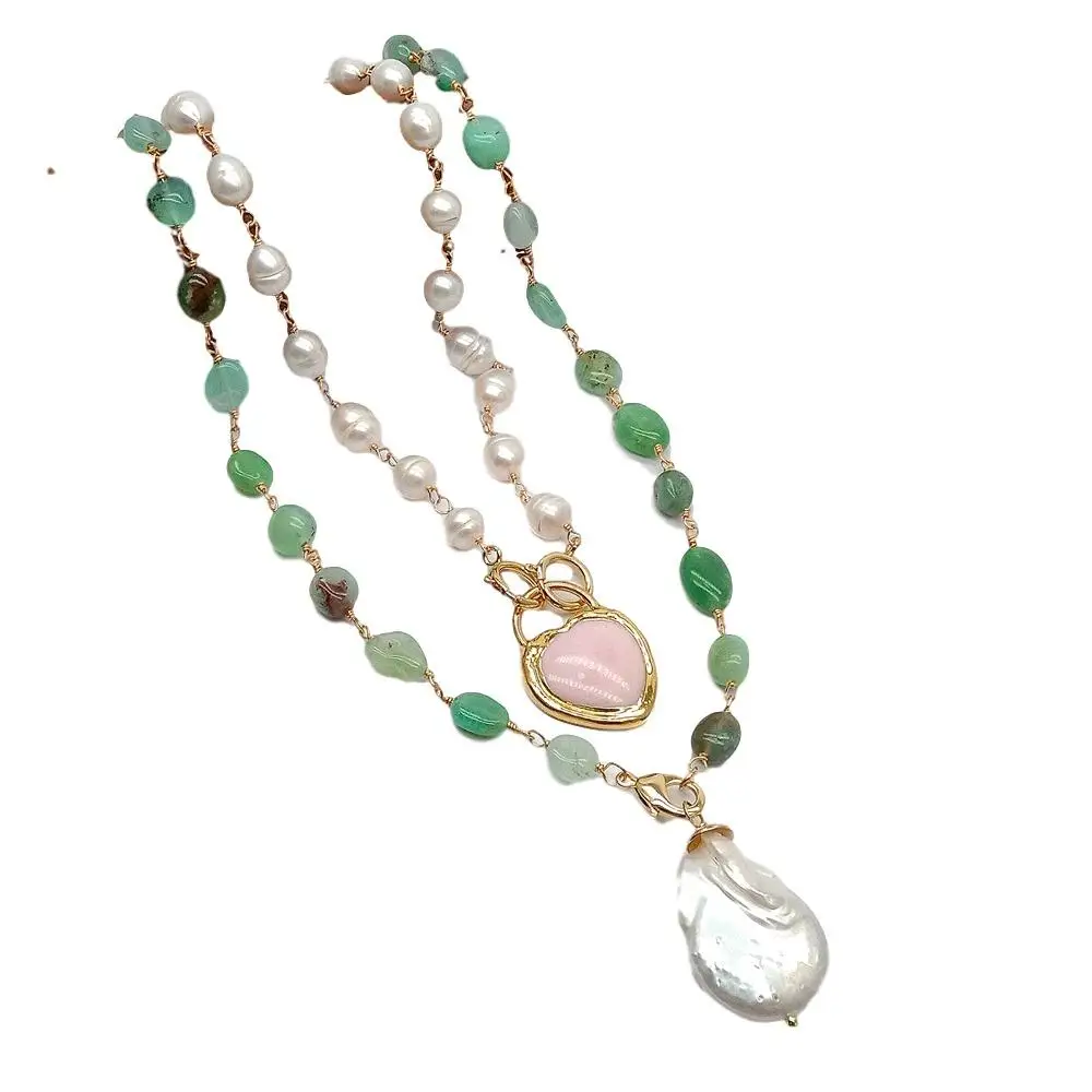Y·YING Freshwater White Pearl Green Chrysoprase Pink Queen Conch Heart Pearl Charm Necklace 19"