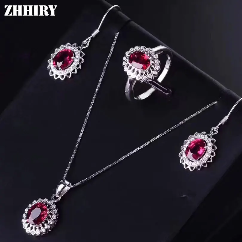 Women Jewelry Sets Natural Pyrope Garnet Gemstone Genuine 925 Sterling Silver Set Ring Earring Pendant Chain Fine Jewelry