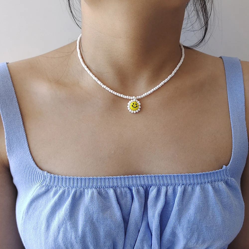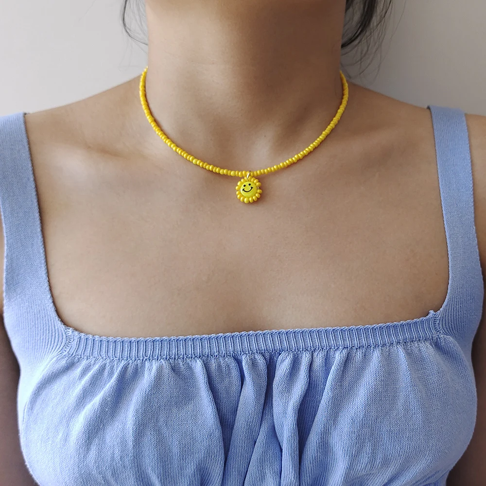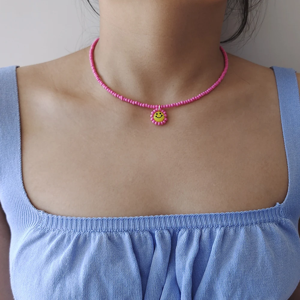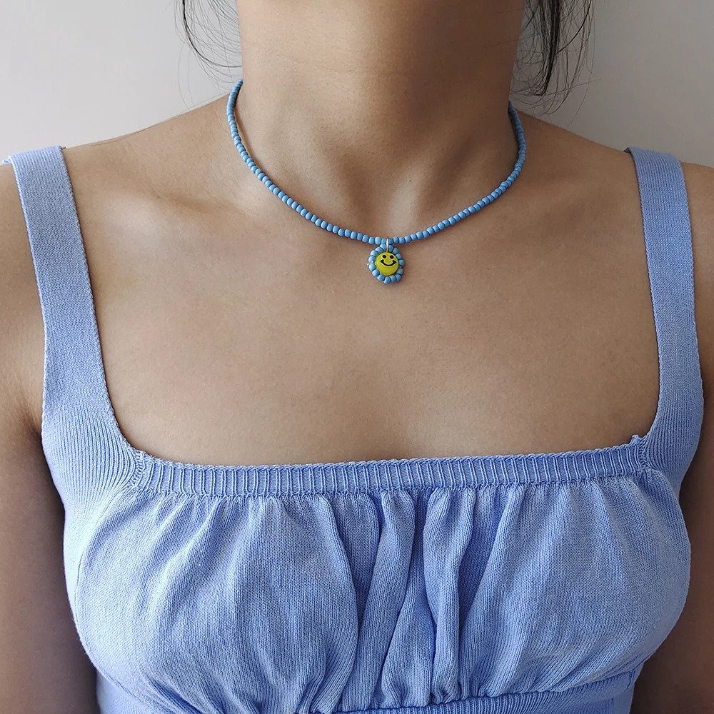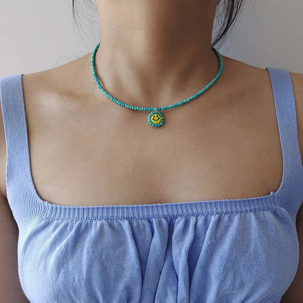 ZX Trendy Handmade Colorful Beaded Chain Choker Necklace Cute Similey Face Pendant Necklace Jewelry Women Accessories