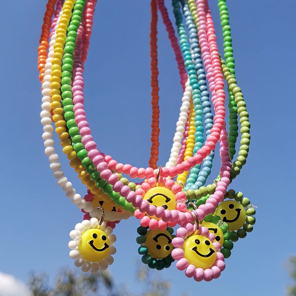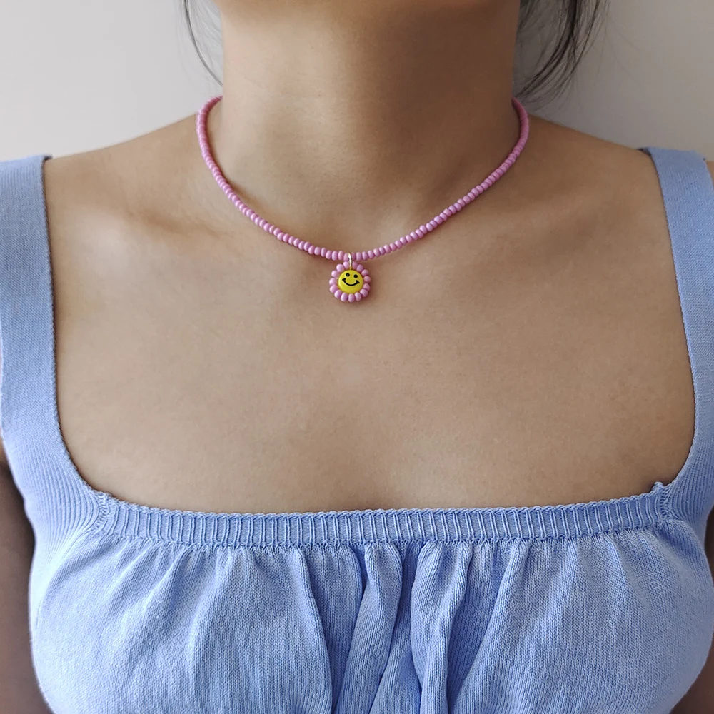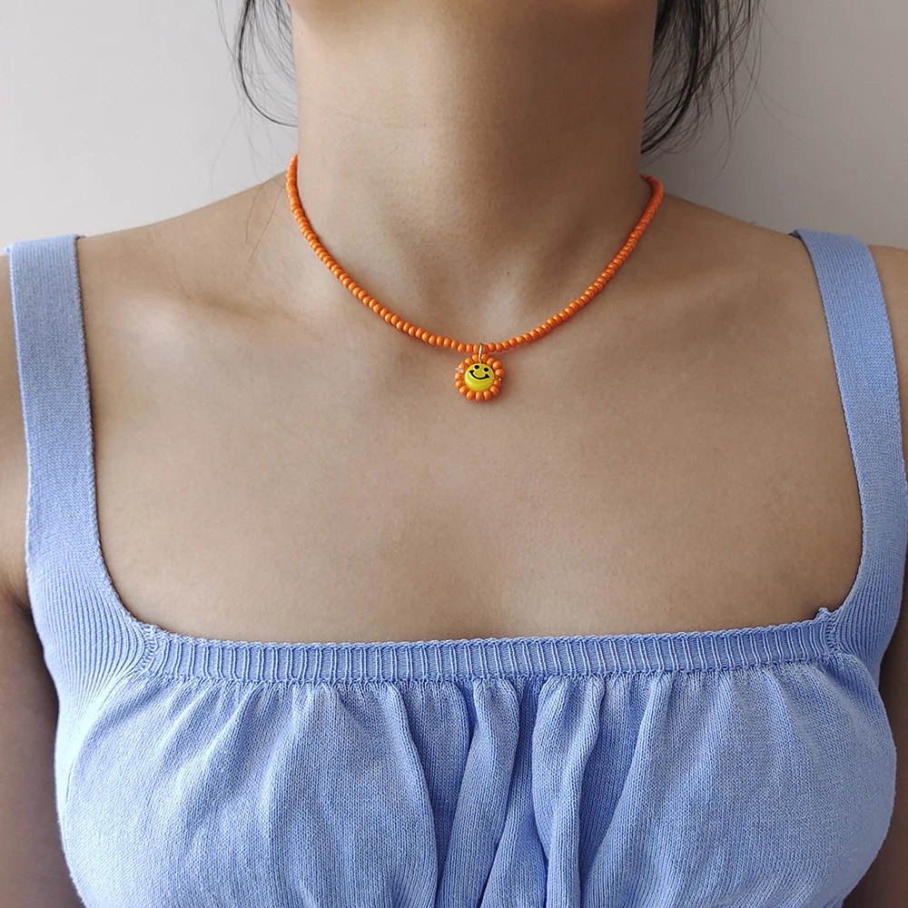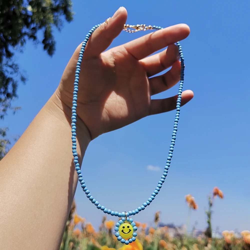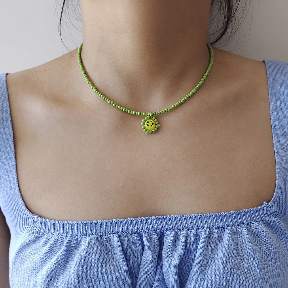 ZX Trendy Handmade Colorful Beaded Chain Choker Necklace Cute Similey Face Pendant Necklace Jewelry Women Accessories