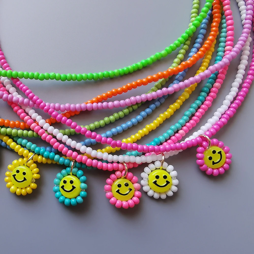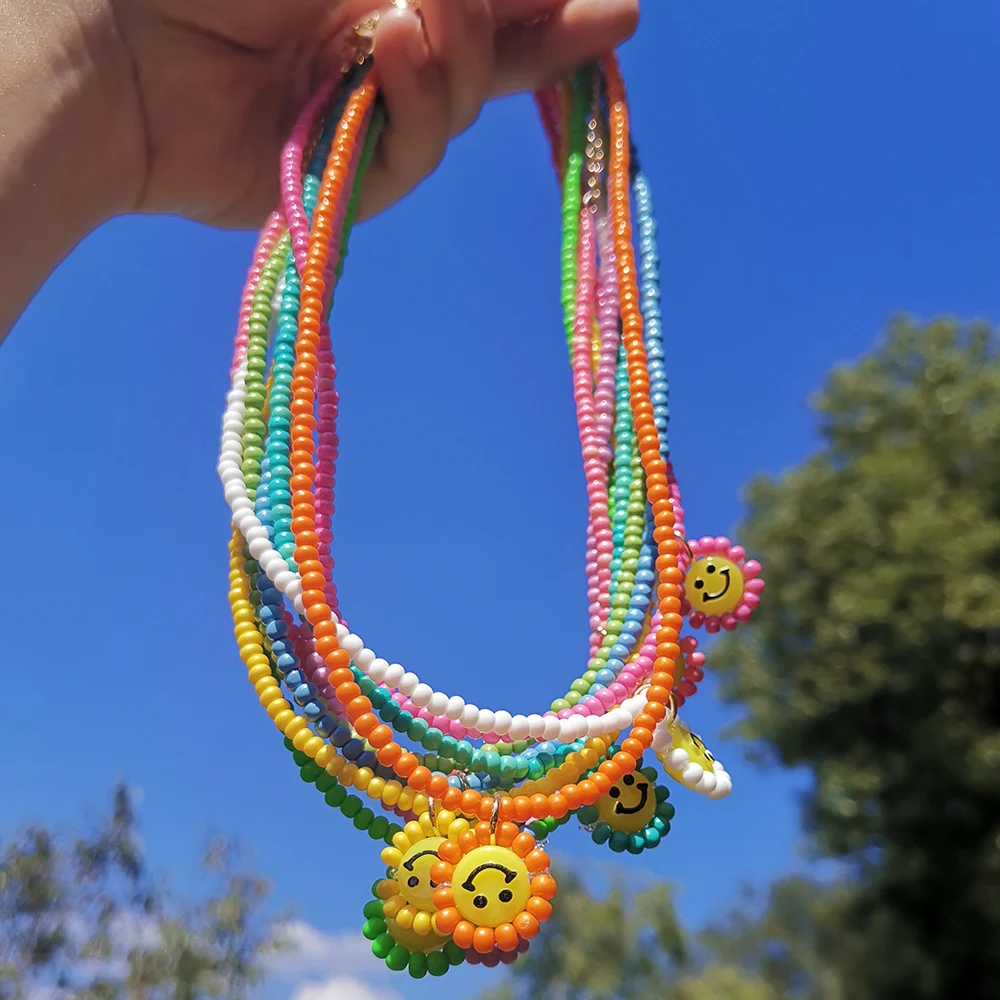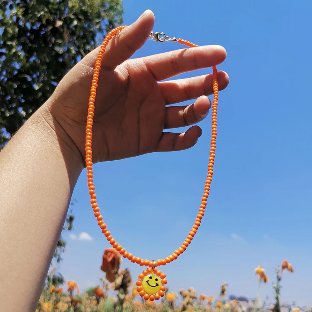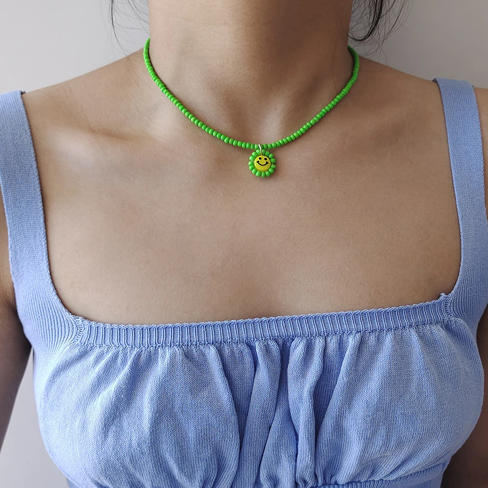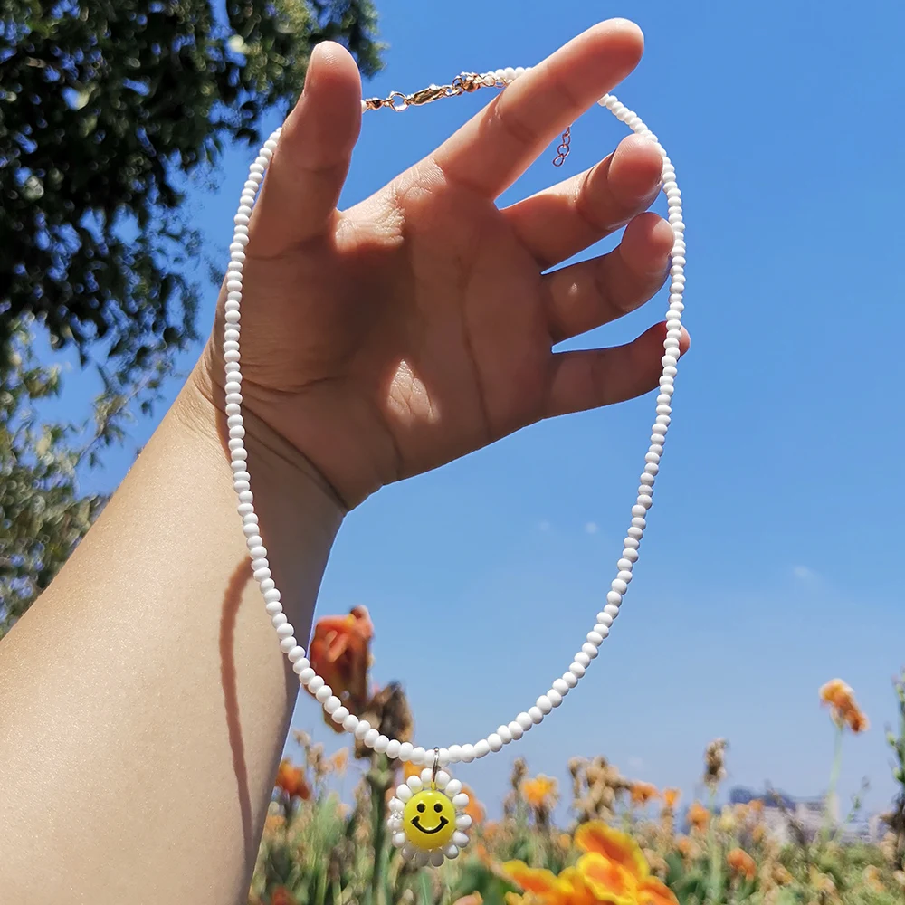 ZX Trendy Handmade Colorful Beaded Chain Choker Necklace Cute Similey Face Pendant Necklace Jewelry Women Accessories
