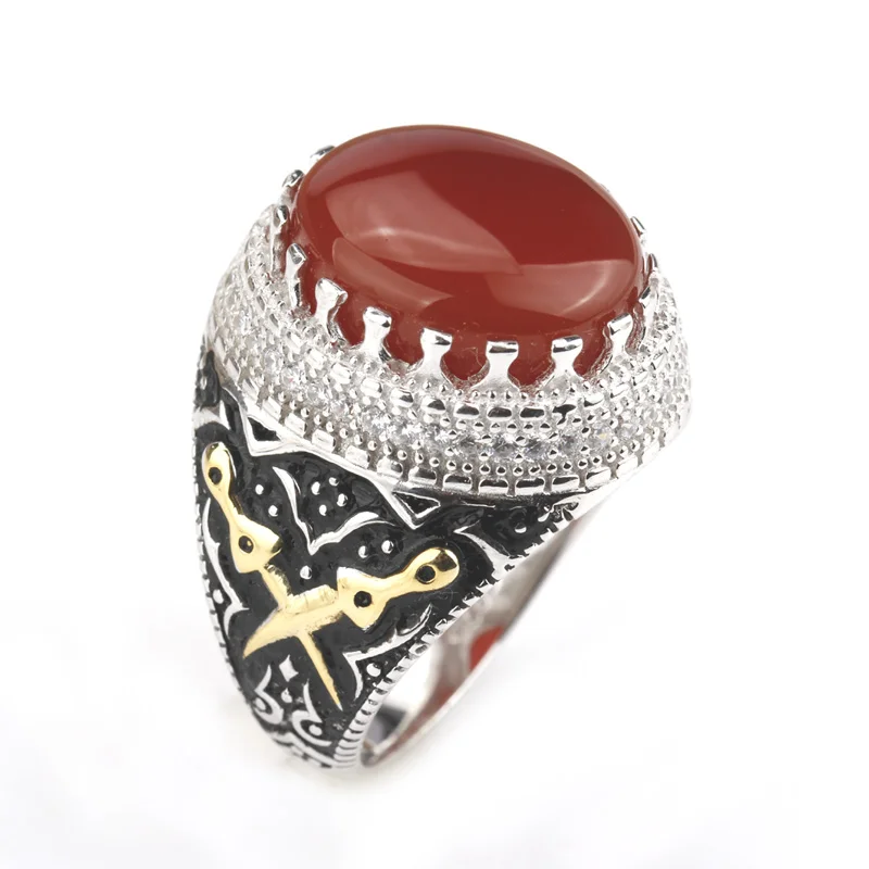 2020 Men Ring Real 925 Sterling Silver Red Agate Big Stone Ring with Double Sword Clear CZ Finger Ring for Men Fine Jewelry