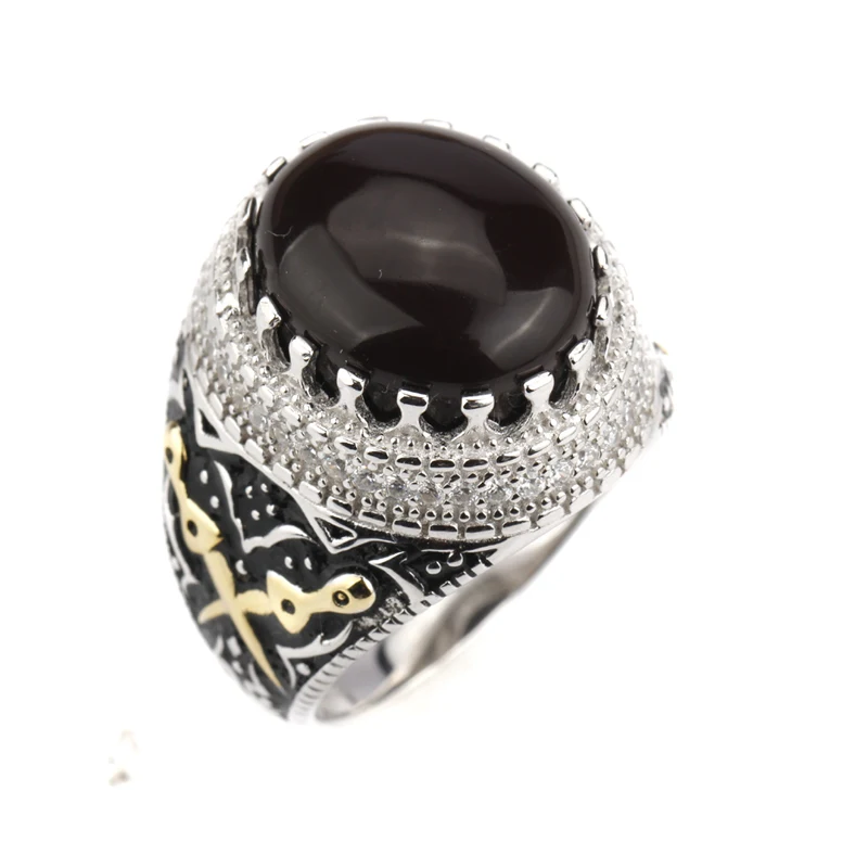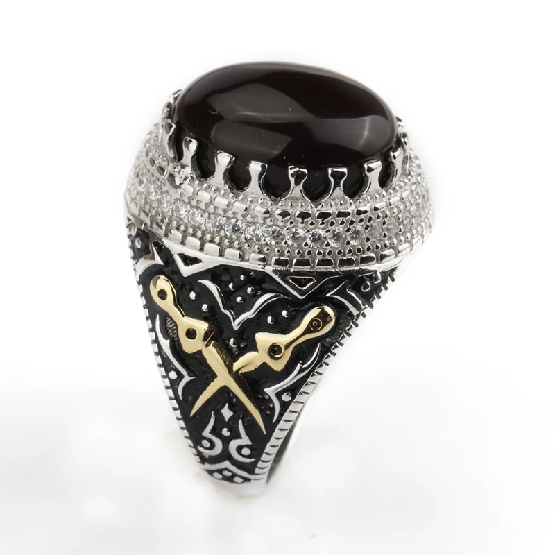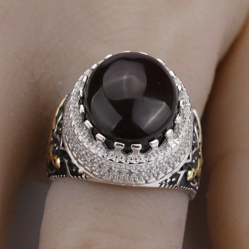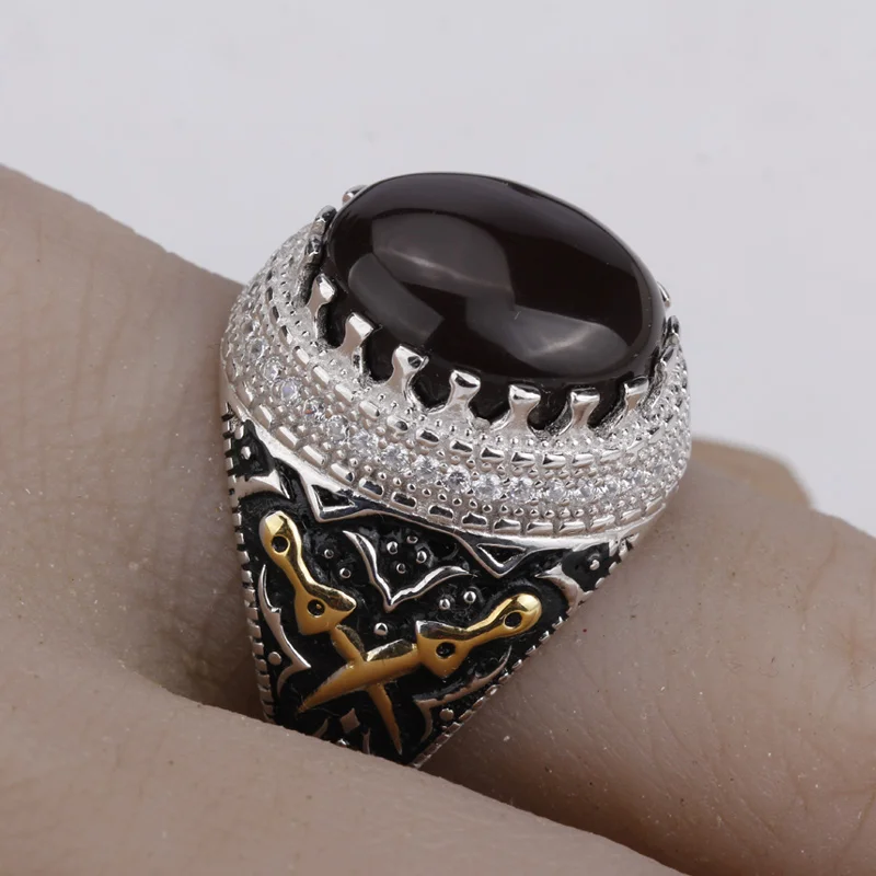 925 Sterling Silver Men Ring Dark Brown Agate Stone with Clear CZ Double Kill Finger Ring for Men Street Fashion Jewelry