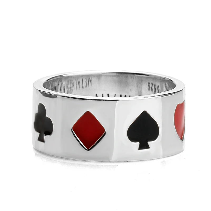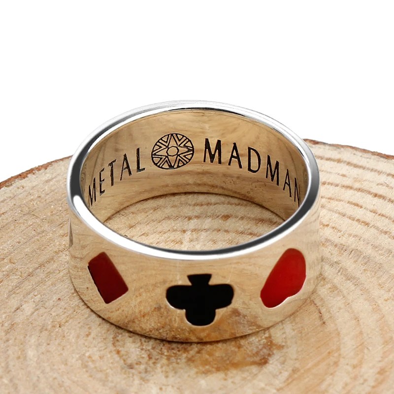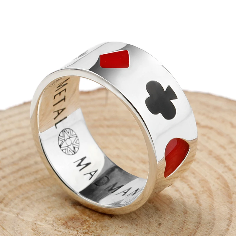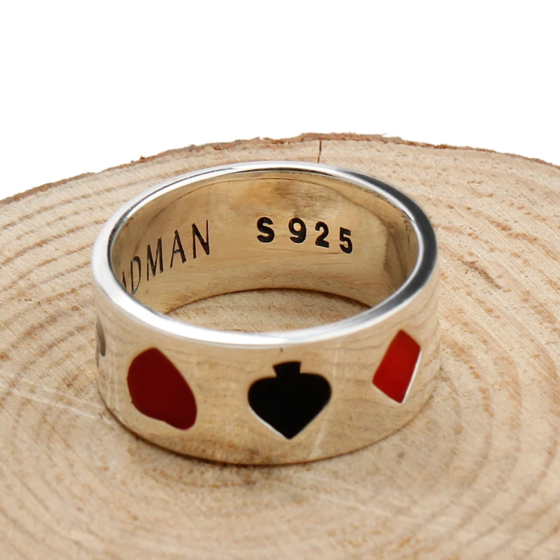 925 Sterling Silver Street Poker Ring with Black and Red Enamel Magician Unique Design for Men Women Lovers Halloween Jewelry