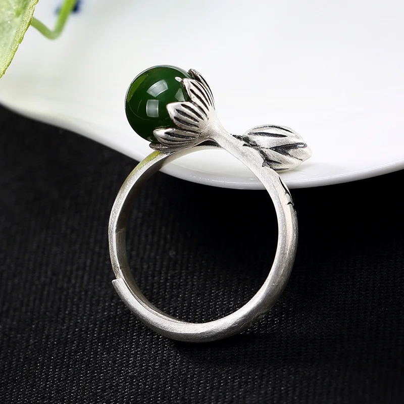 Elegance Lotus Natural Jade Ring For Women Girl 100% 925 Sterling Silver Adjustable Ring Wedding Gift