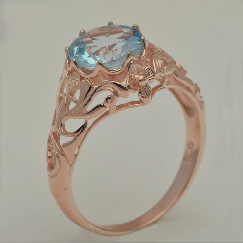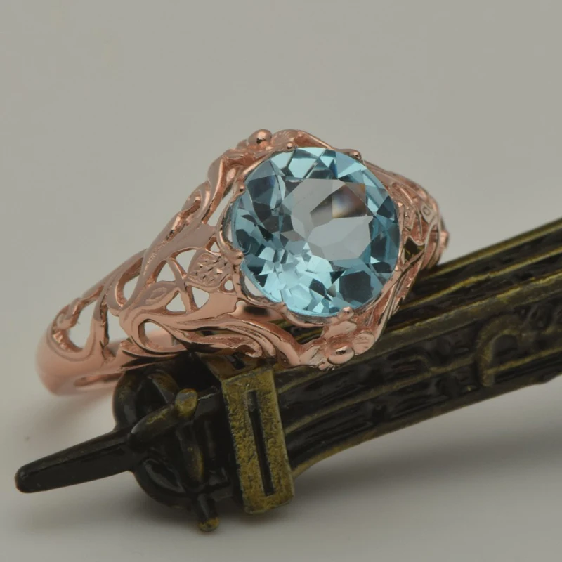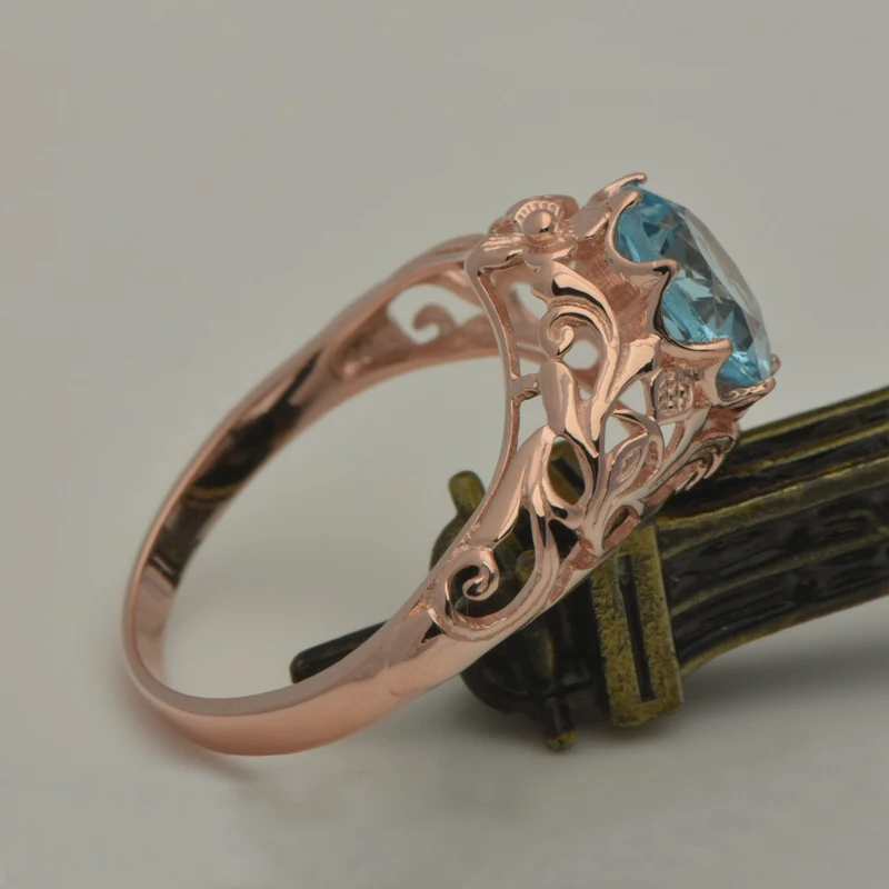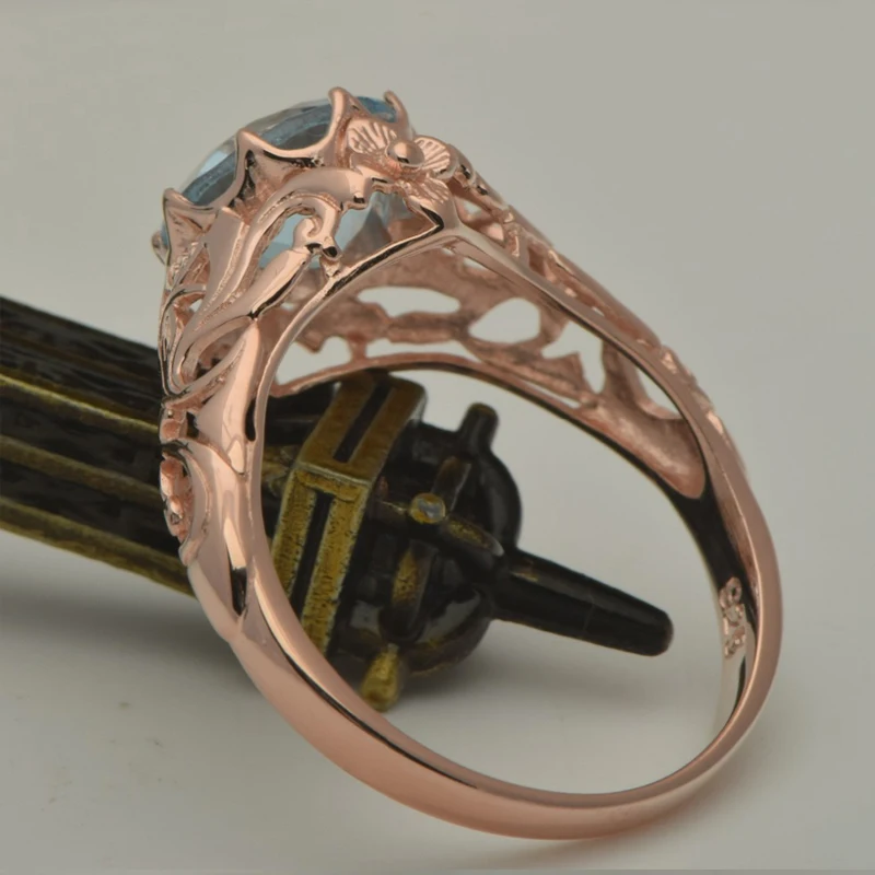 unique custom processing rose gold color jewelry fine carving pattern design blue stone 925 silver ring