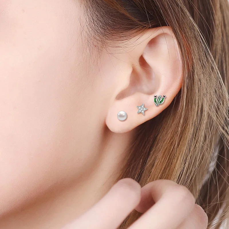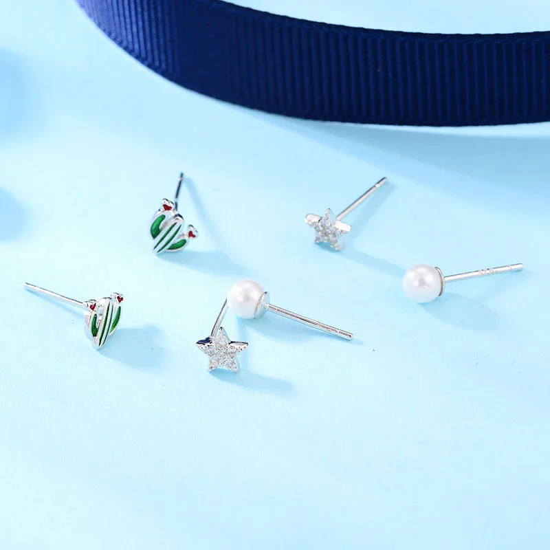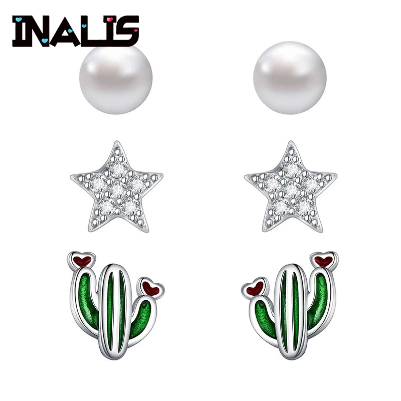 New Delicate Cute Fine Jewelry S925 Sterling Silver 3 Pairs Stud Earrings as One Set Pear Star Cactus Brincos with CZ