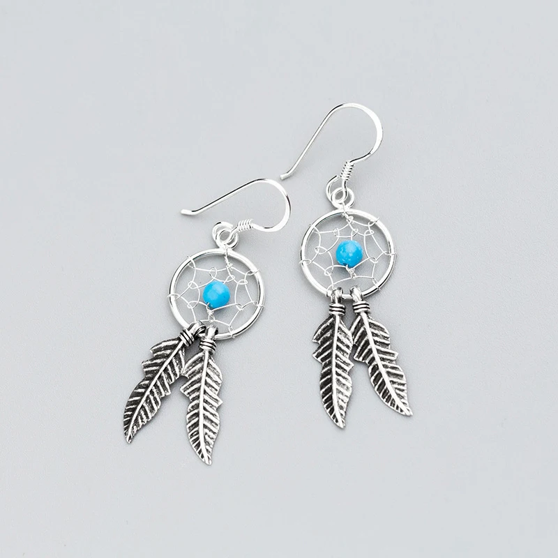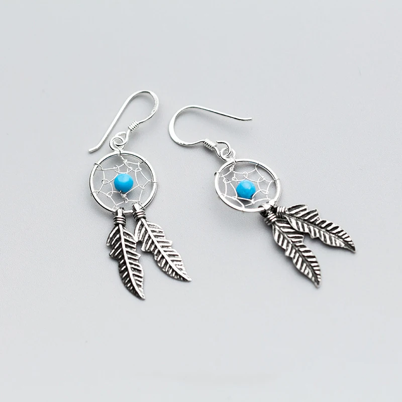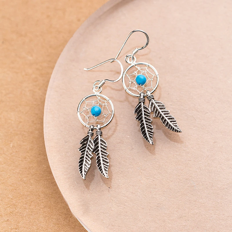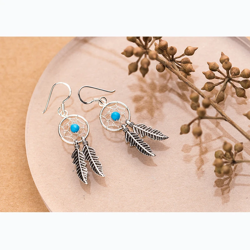 New Ethinic Punk Drop Earring 925 Sterling Silver Single Turquoise Round Net with Feather Dangle Brincos Ear Hook Gift