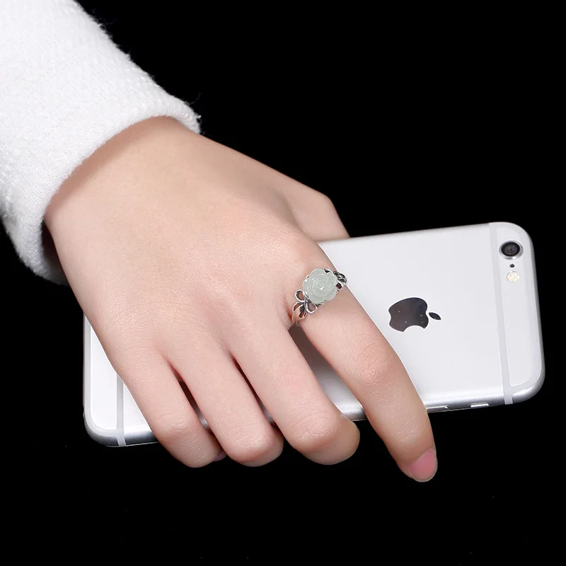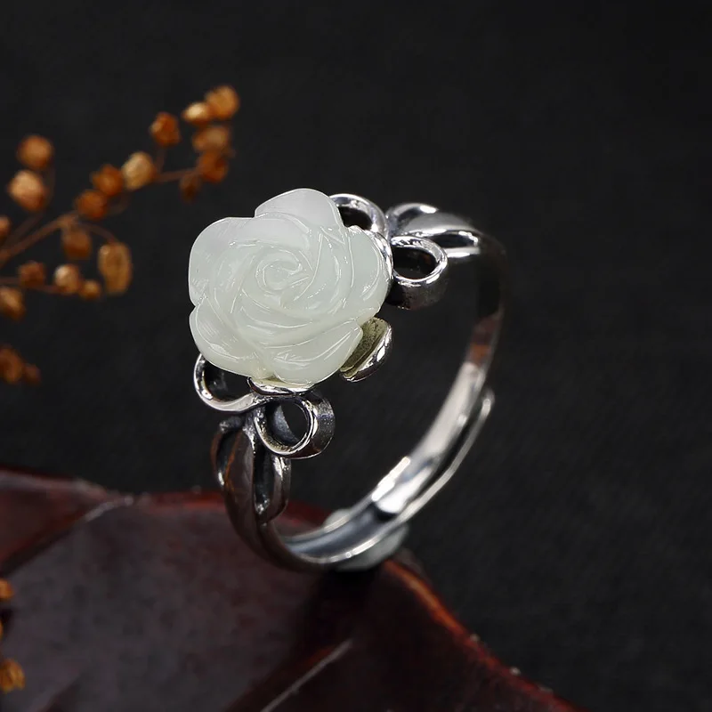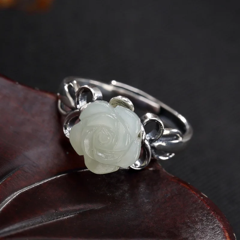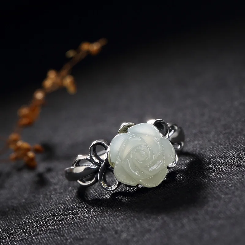 S925 pure silver inl restoring ancient ways hetian jade white jade lady rose silver ring ring