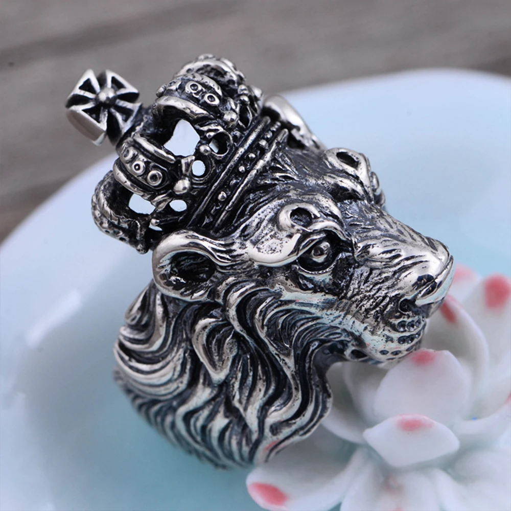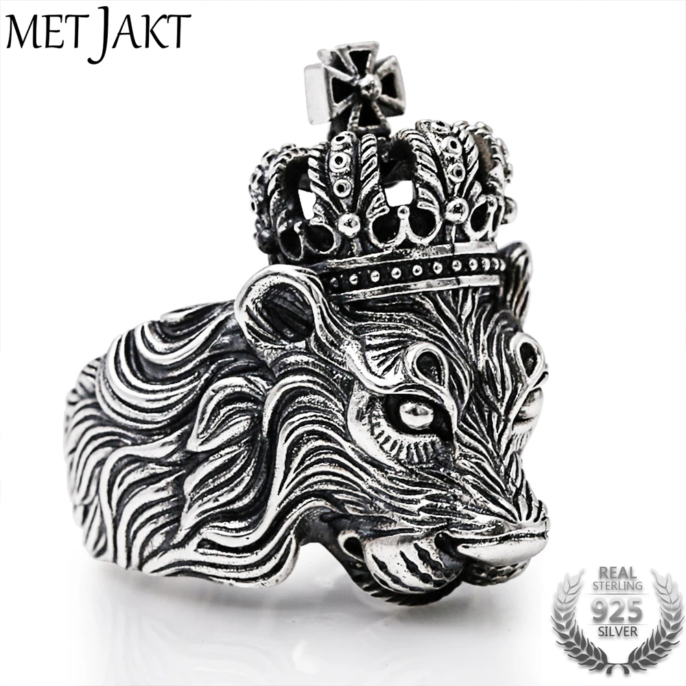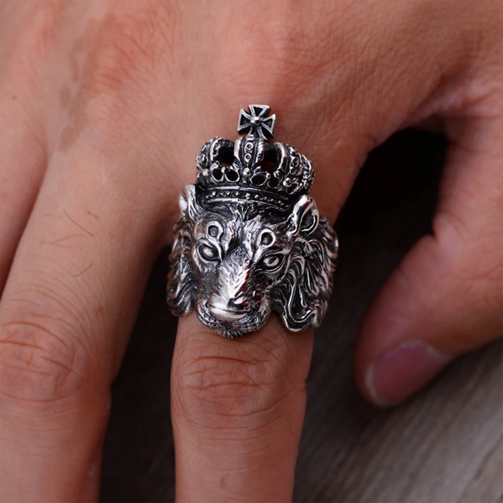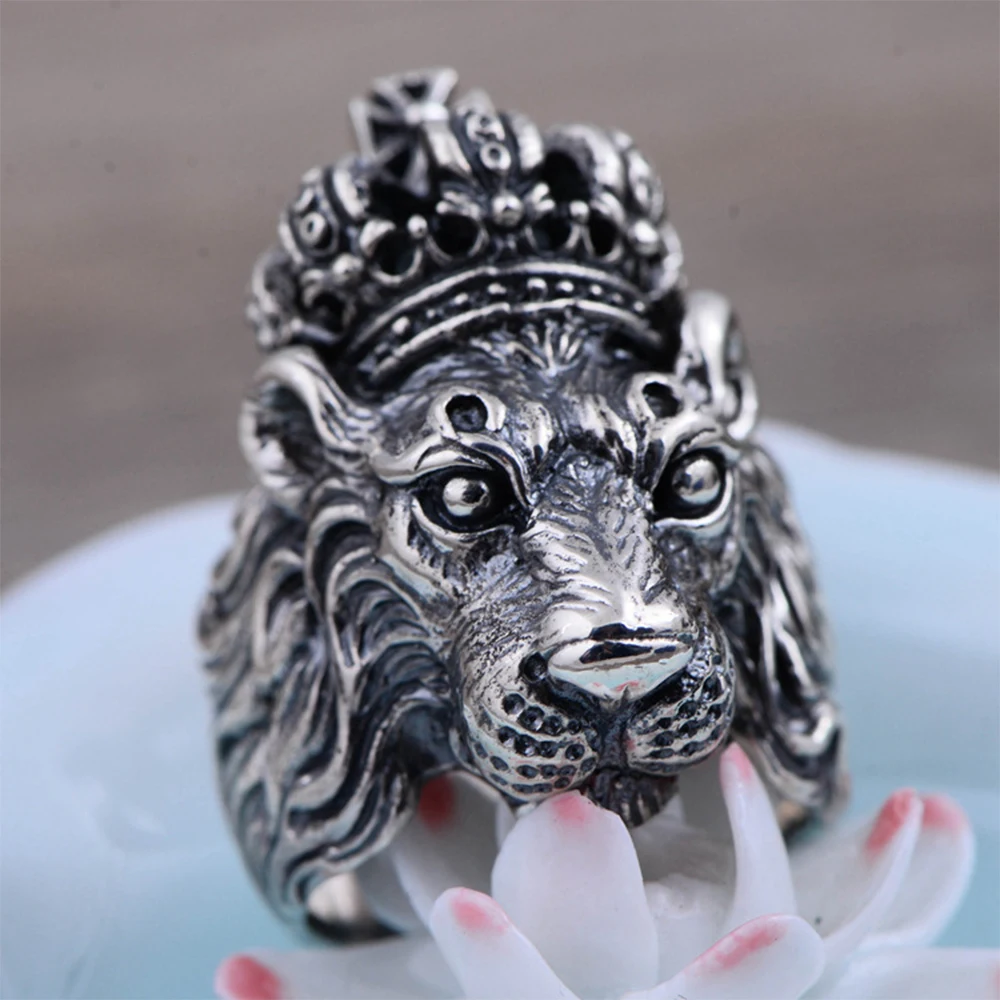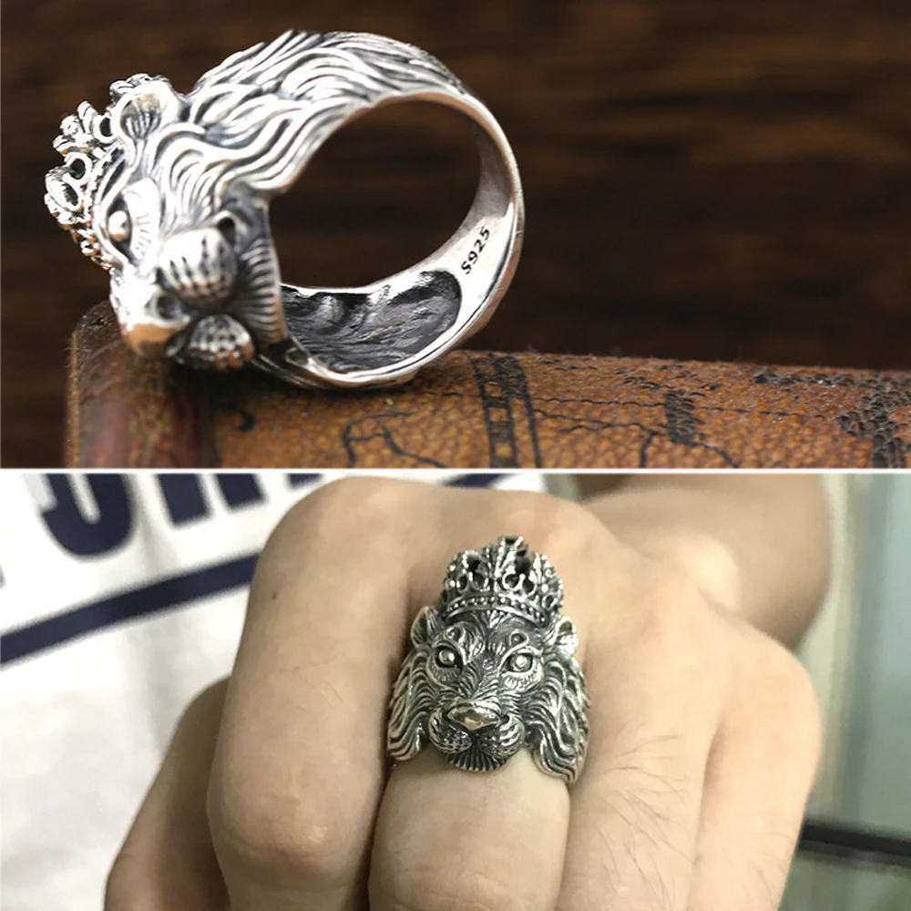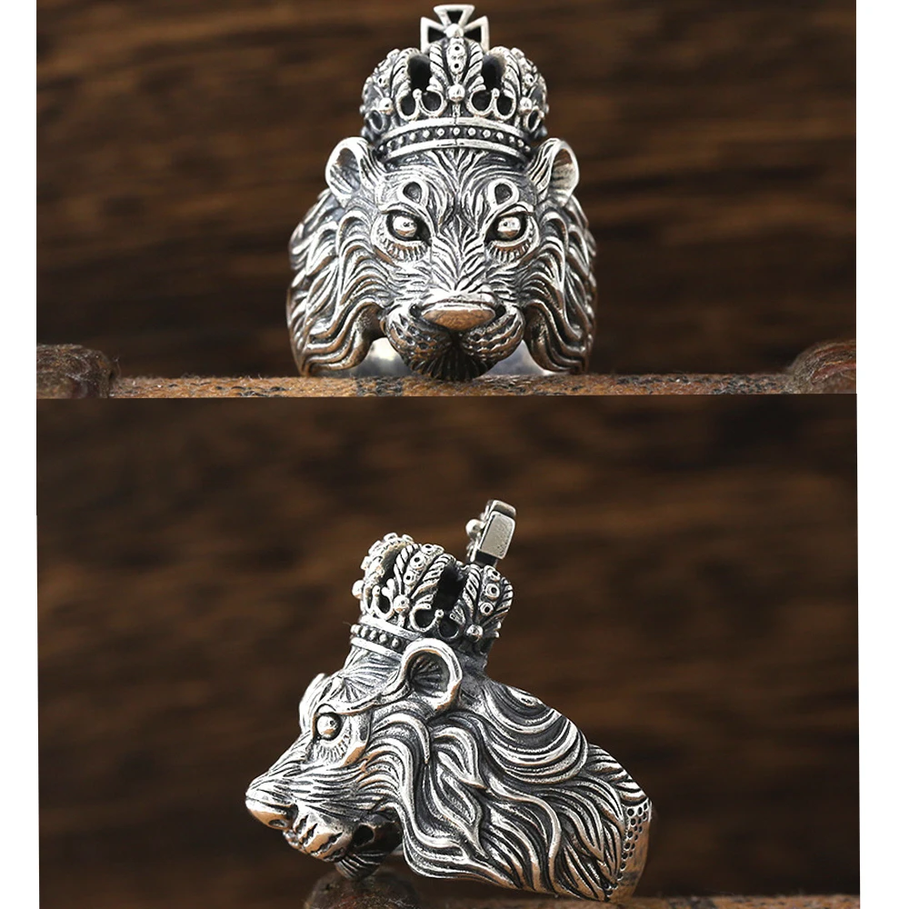 Punk Rock 925 Sterling Silver Crown Lion King Ring for Ride A Motorcycle Co Men Rings Vintage Thai Silver Jewelry