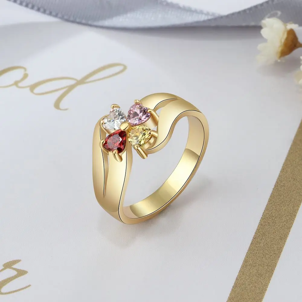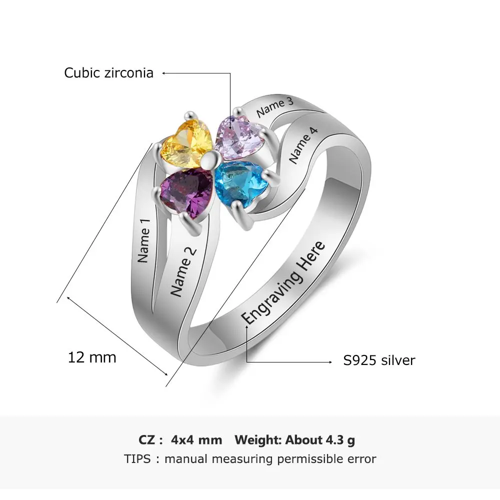 Personalized Heart Birthstone Flower Ring Real 925 Sterling Silver Customized Engraved Name Ring Gift for Family (Lam Hub Fong)