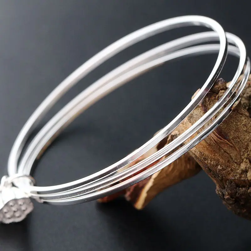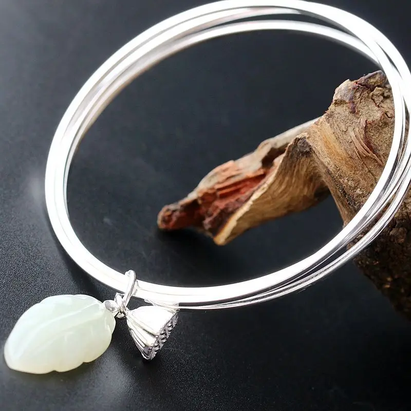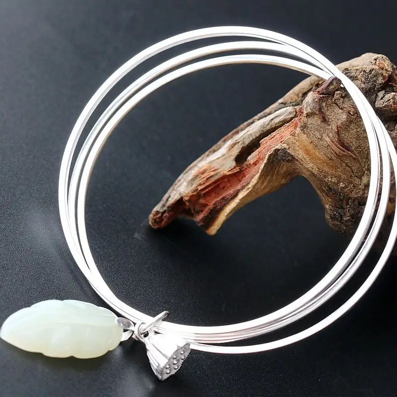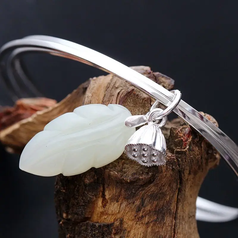 Retro Silver Decoration Natural Hetian Jade Handmade Silver Bangle Lotus Ring Multi-Purpose S925 Sterling Silver Bangle Women