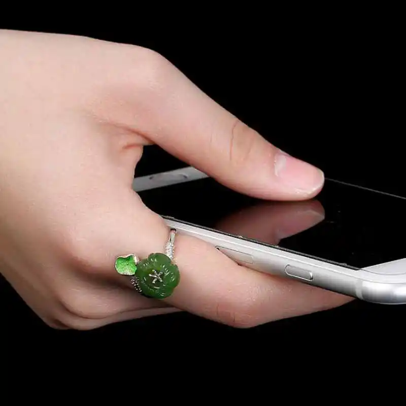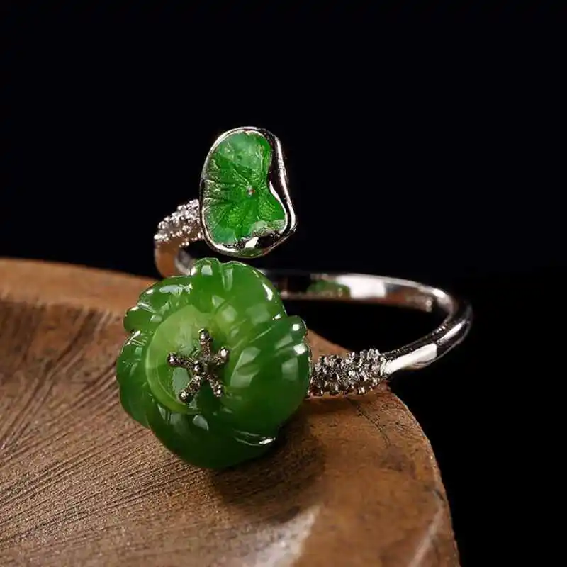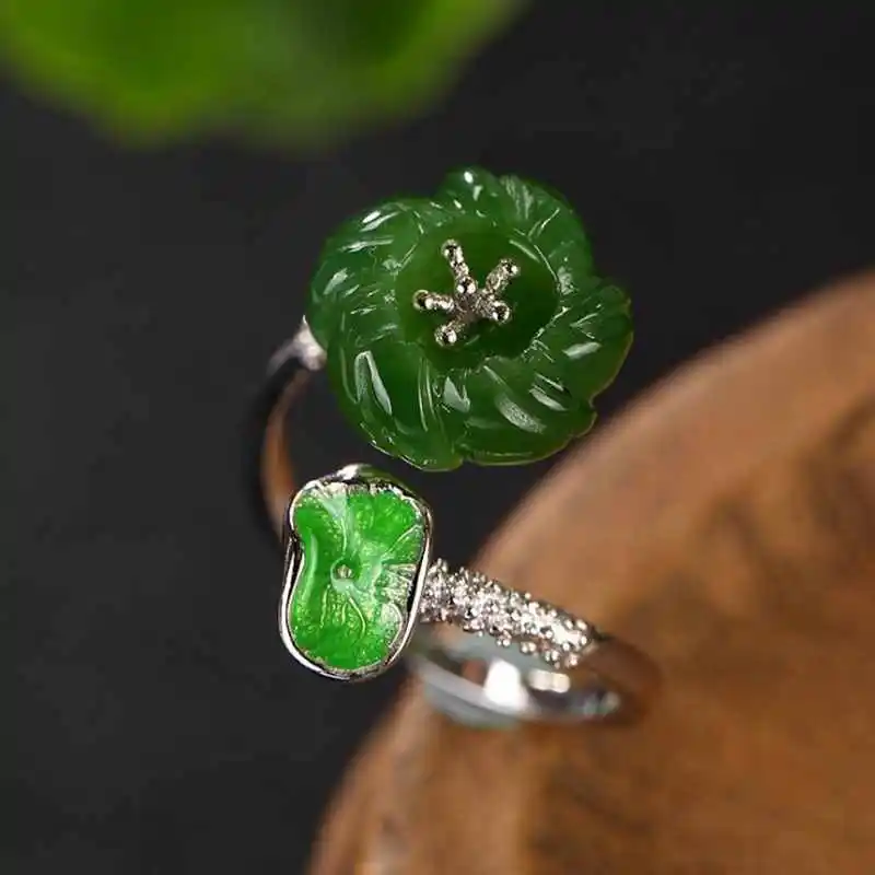 Chinese Ethnic Style Genuine 925 Sterling Silver Rings for Women Flower Leaf Hetian Jasper Silver 925 Jewelry YRI138
