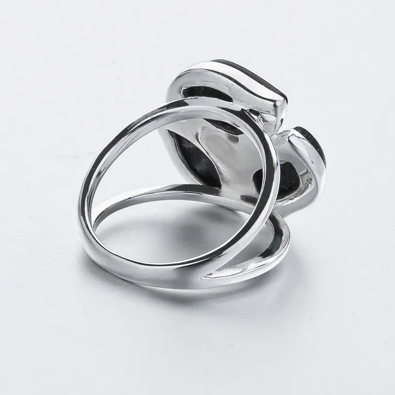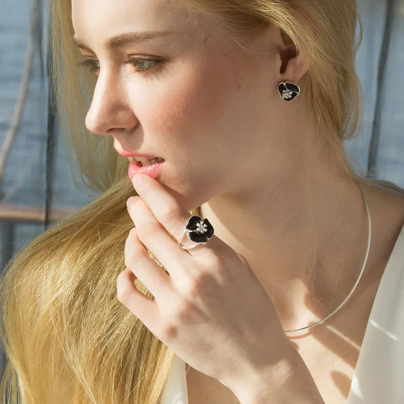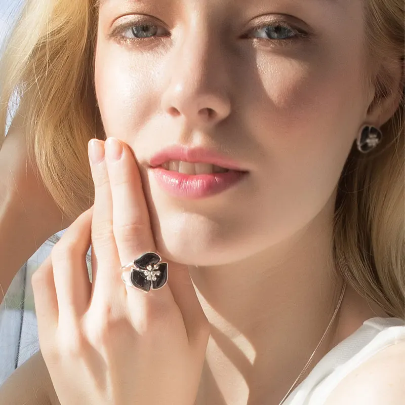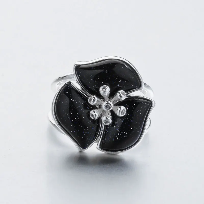 Genuine 925 Sterling Silver Black Gemstone Rings for Women Wedding Fine Jewelry AAA Cubic Zirconia Flower Rings