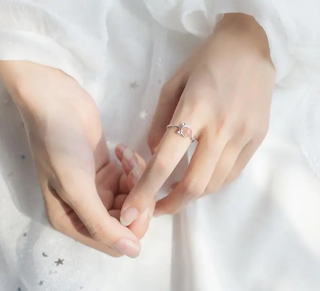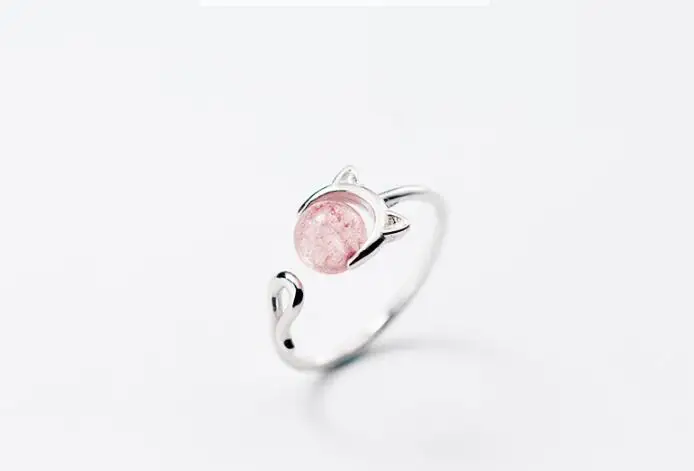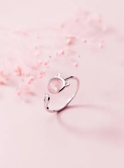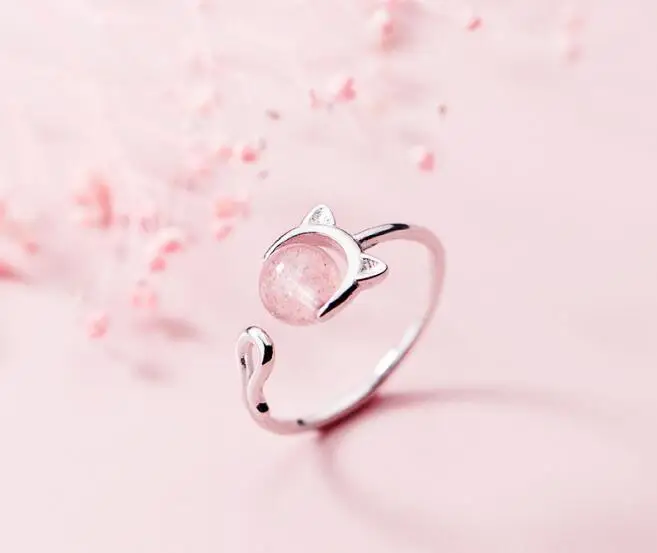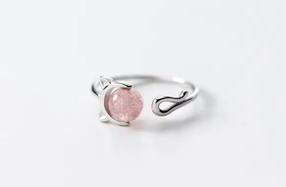 SIZE4.5-SIZE6 100% Authentic REAL.925 Sterling Silver Fine Jewelry Rose Strawberry Quartz Stone Kitten Cat Ring GTLJ1428