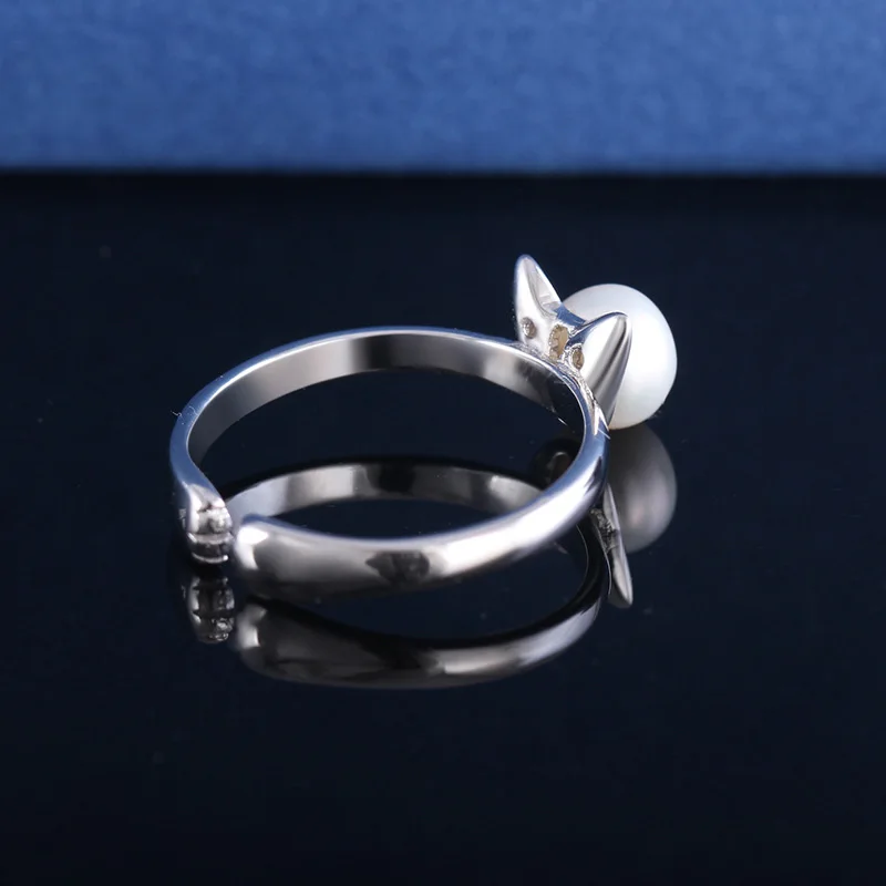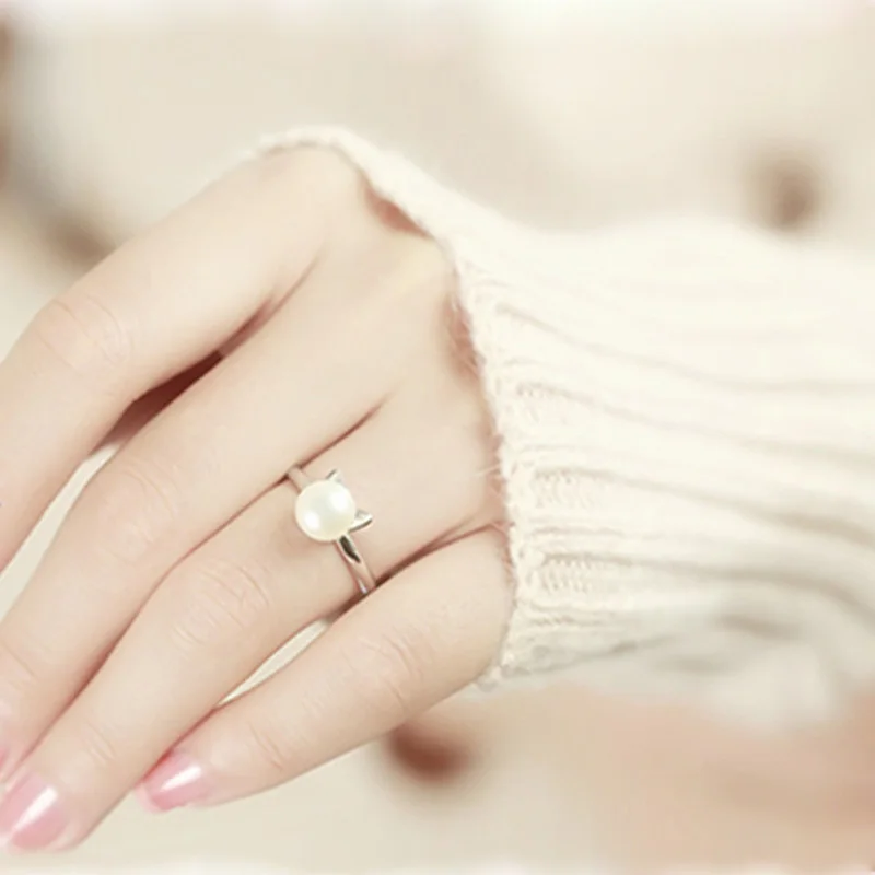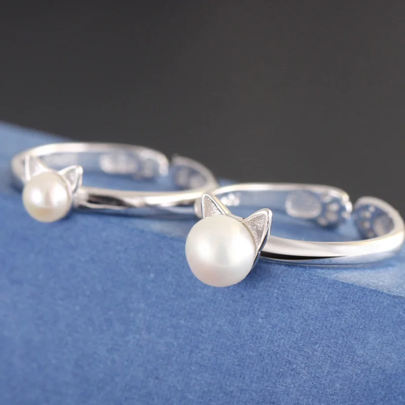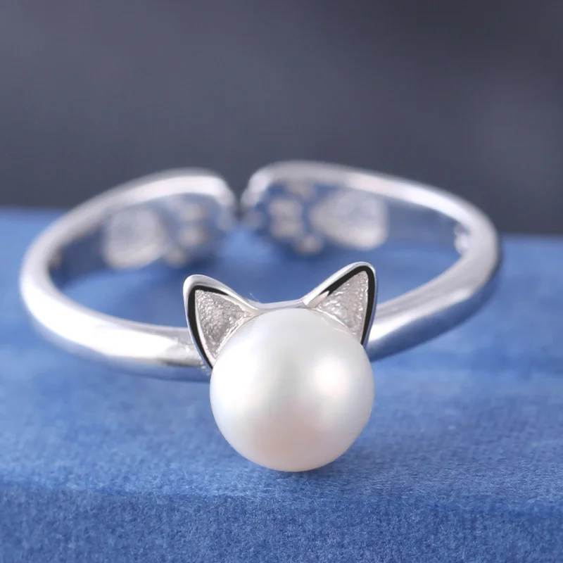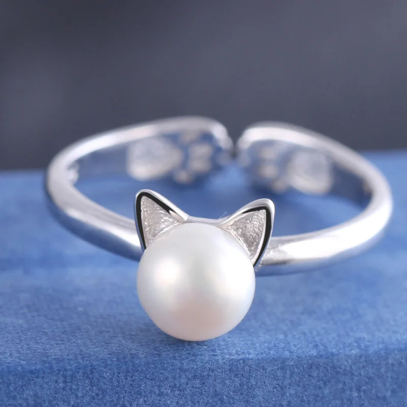 925 Sterling Silver Rings for Women Girls Pearl Cat Ear Ring Cute Animal Adjustable Ring Femme Bijoux Jewelry Birthday