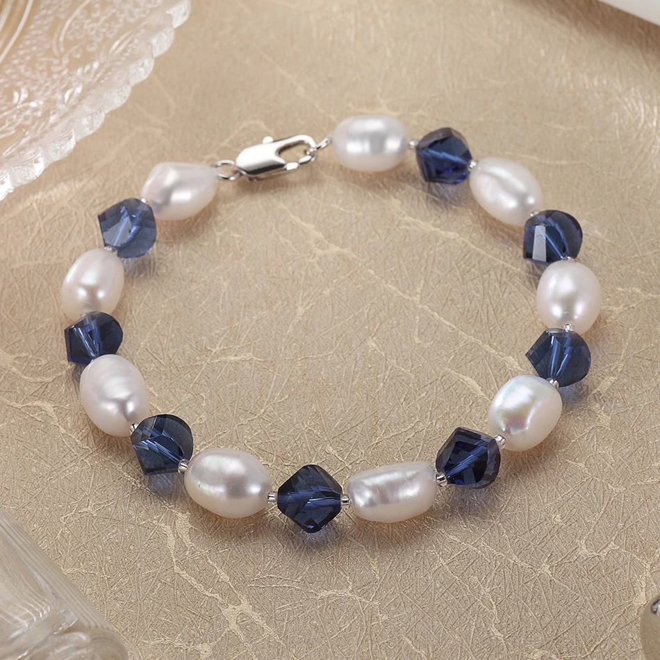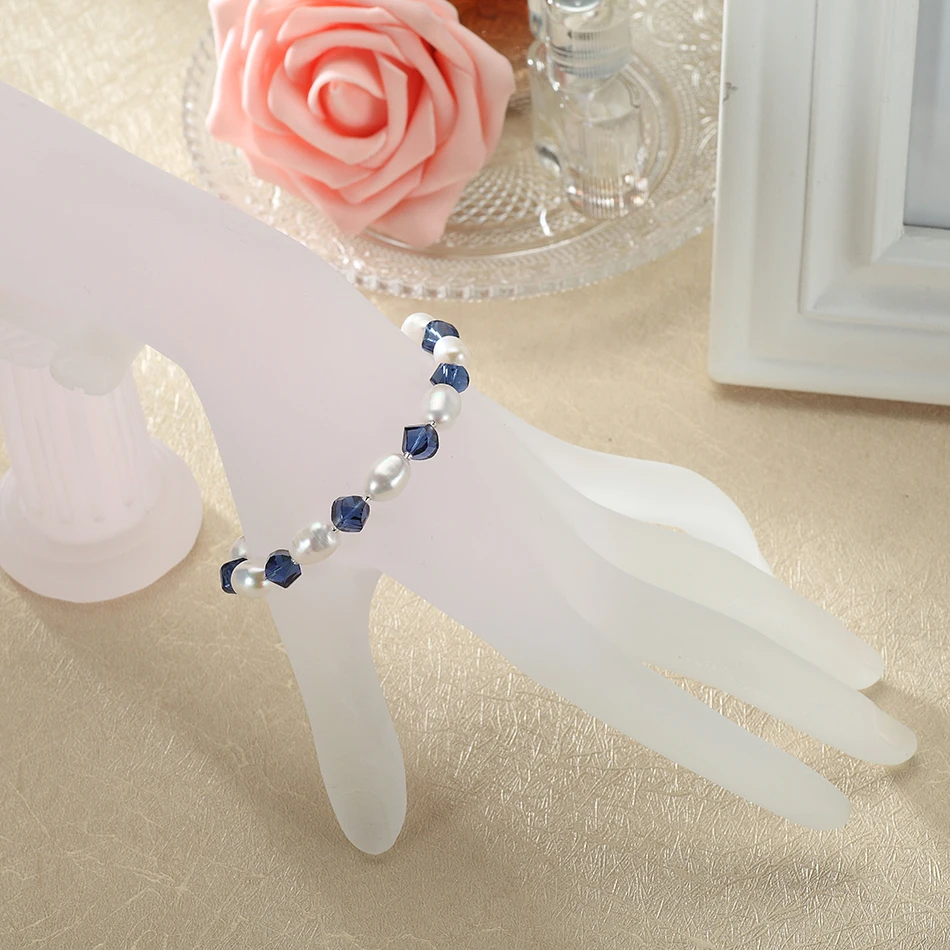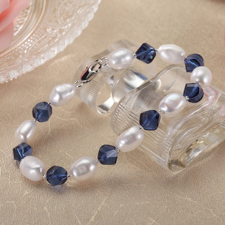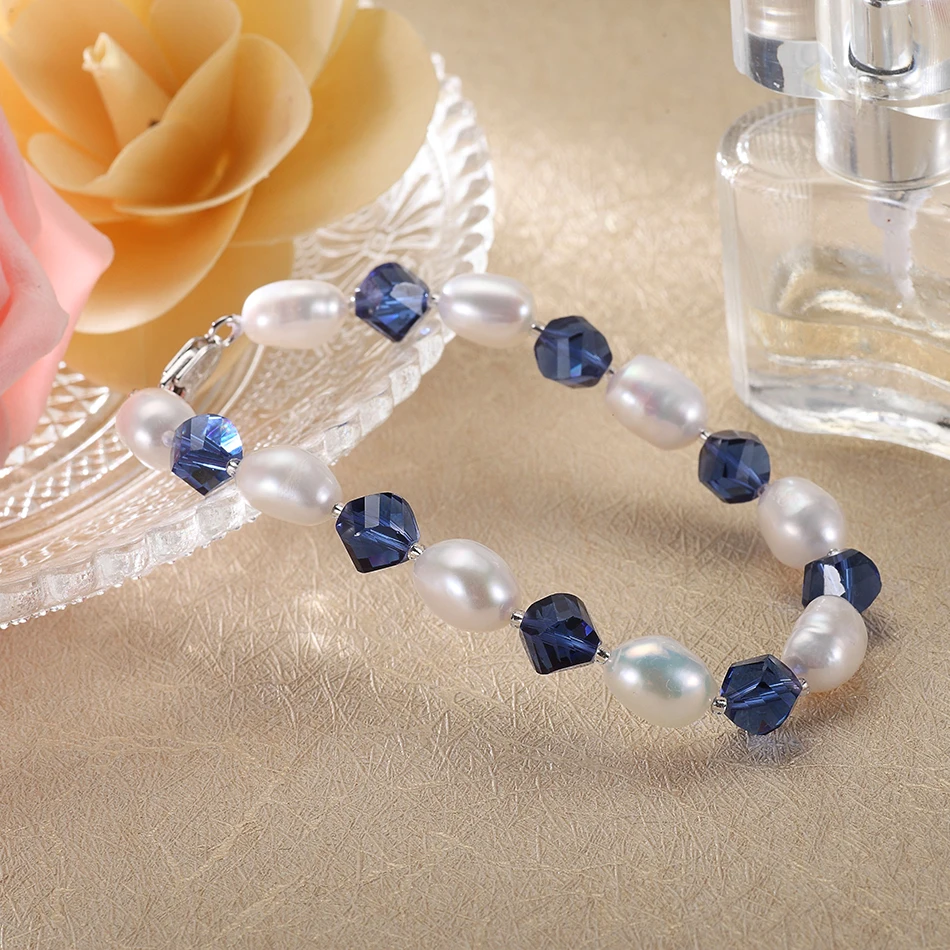 offer 7-8MM White Pearl Bracelet for Women's Blue Crystal Strand Bracelets Baroque style Pearl Jewelry