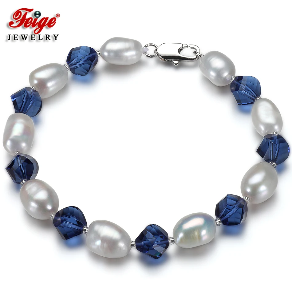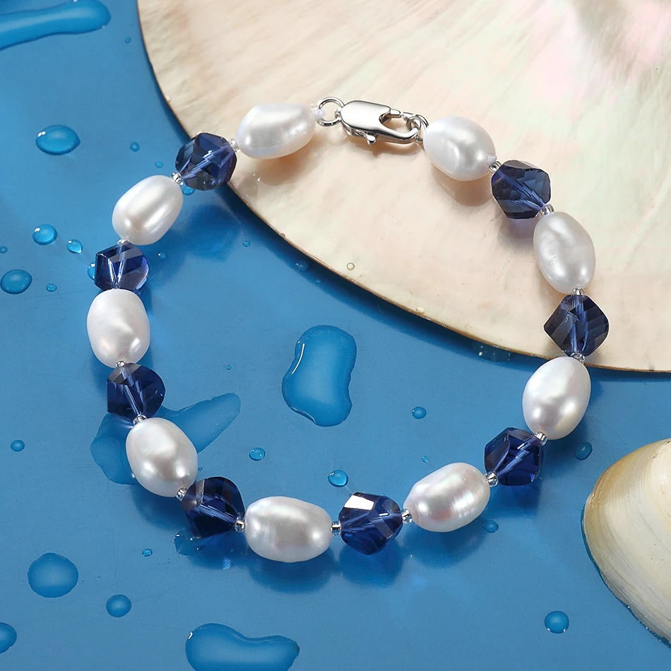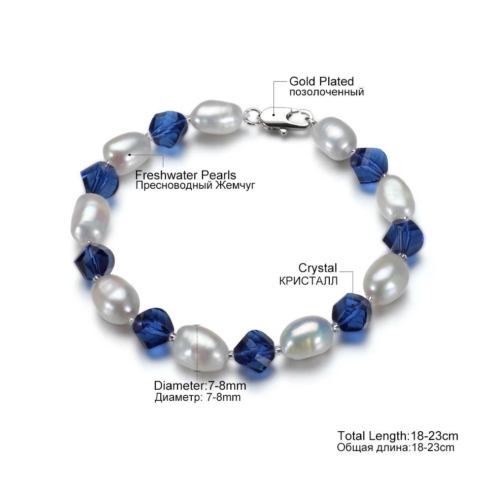 offer 7-8MM White Pearl Bracelet for Women's Blue Crystal Strand Bracelets Baroque style Pearl Jewelry