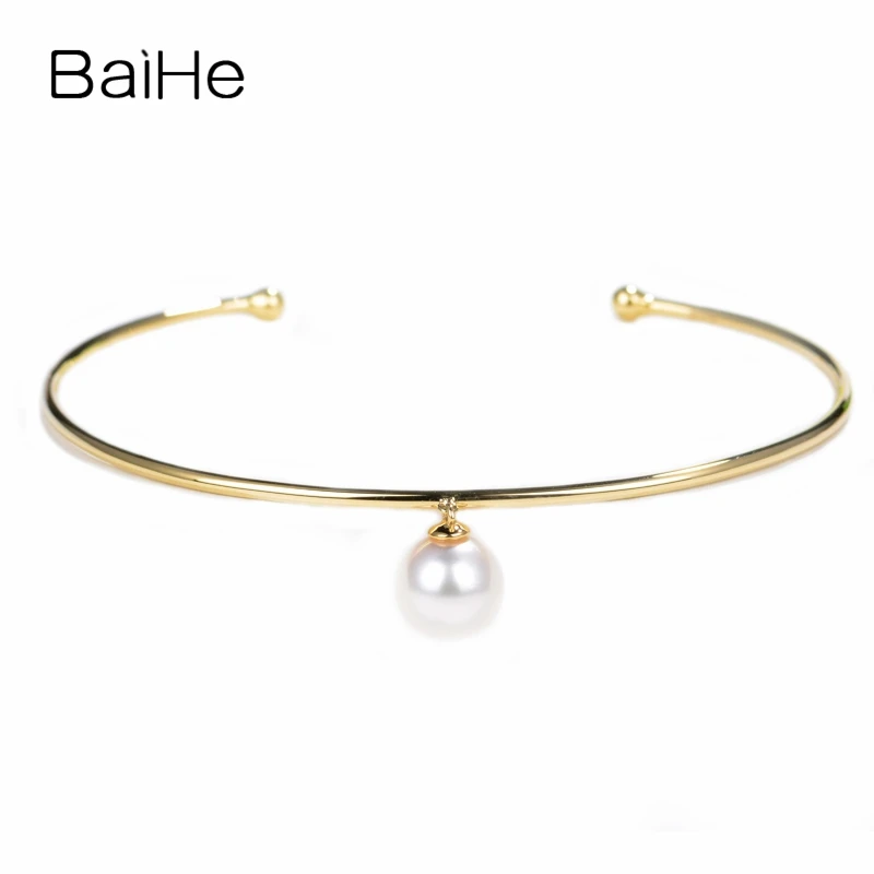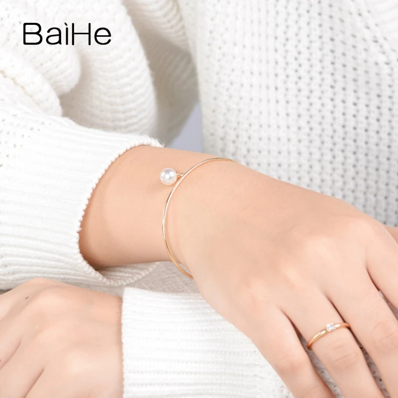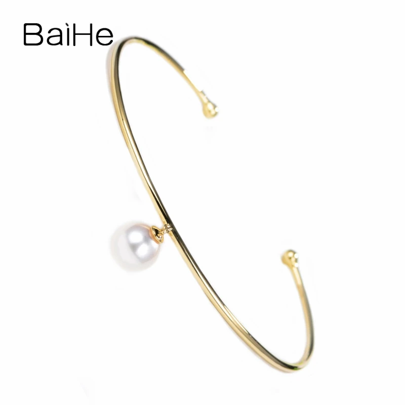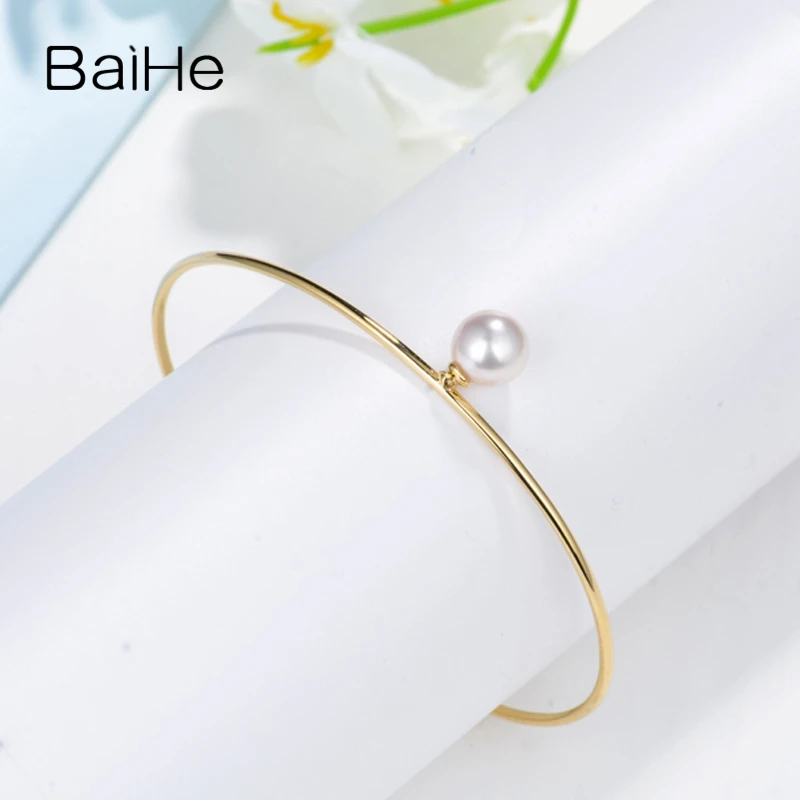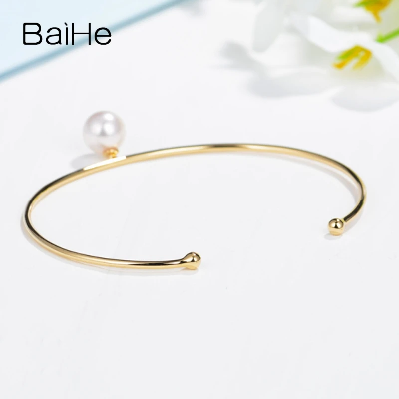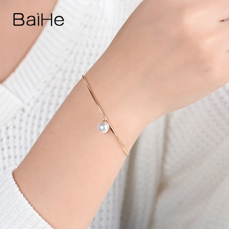 BAIHE Solid 14K Yellow Gold About 7.5mm 100% Genuine Natural pearl Wedding Women Trendy Fine Jewelry Gift Bracelet