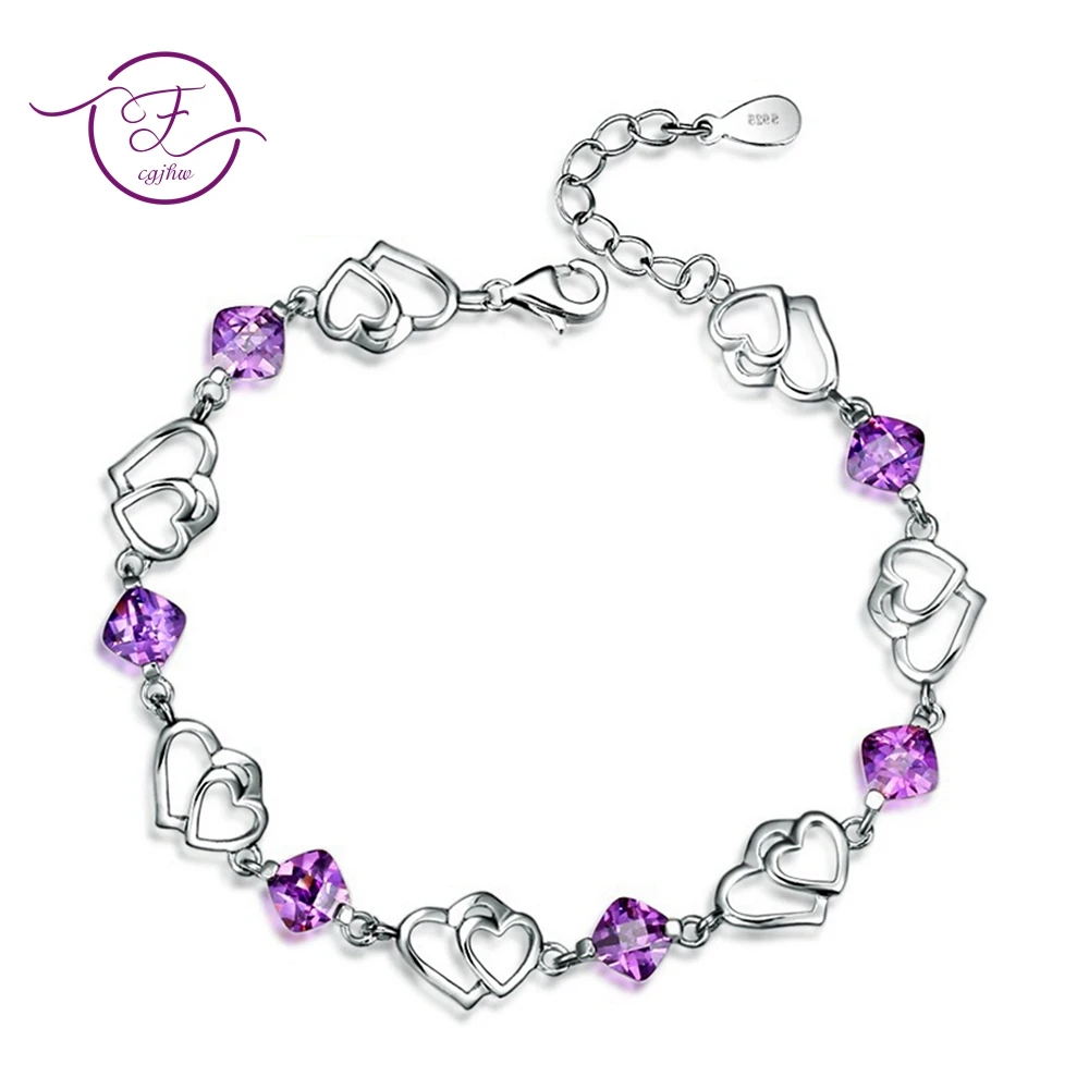 Bracelets For Women Jewelry 925 Sterling Silver Natural Purple Amethyst Double Love Heart Wedding Engagement Christmas Gift
