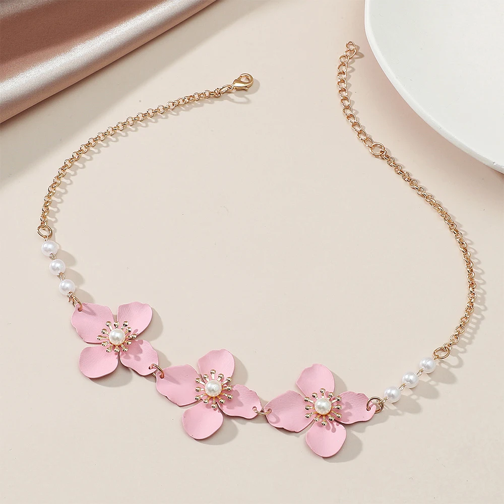 Korean Gold Pink Flower Daisy Pearls Clavicle Necklaces for Women Girls Bohemia Wedding Party Jewelry Flower Pearl Accessory