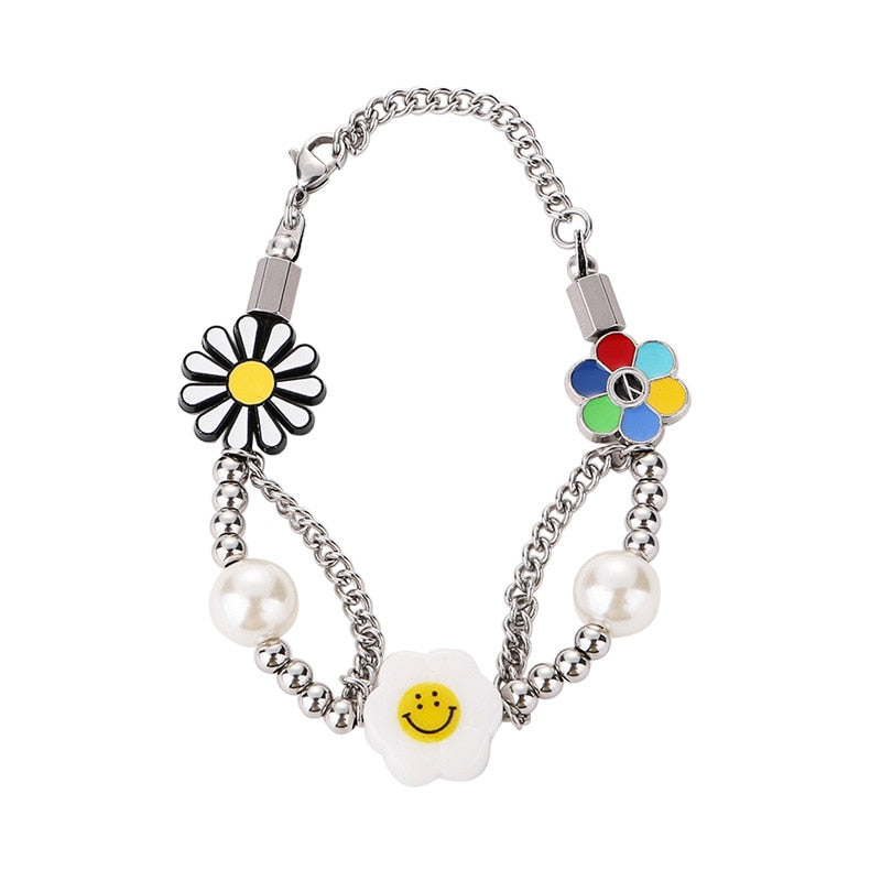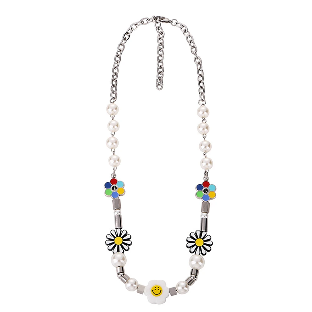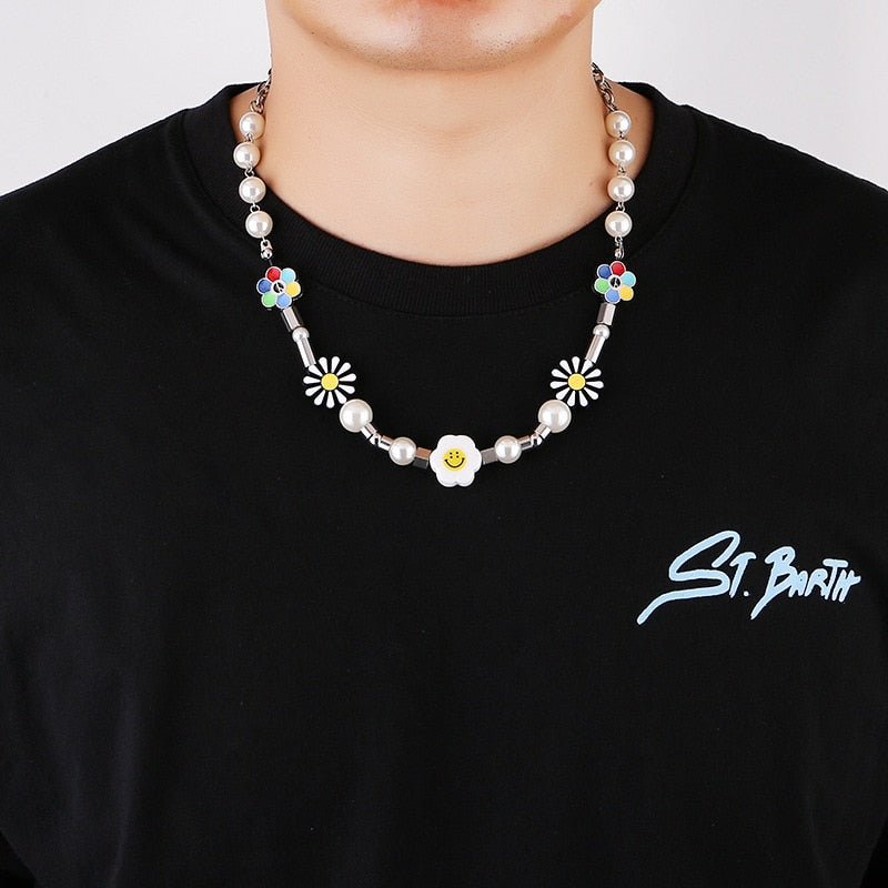 Luokey Korean Japan Daisy Necklace Men Hip Hop Stainless Steel Flower Pearl Chain Necklaces Women Wedding Party Jewelry