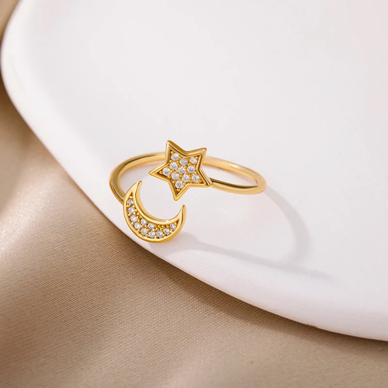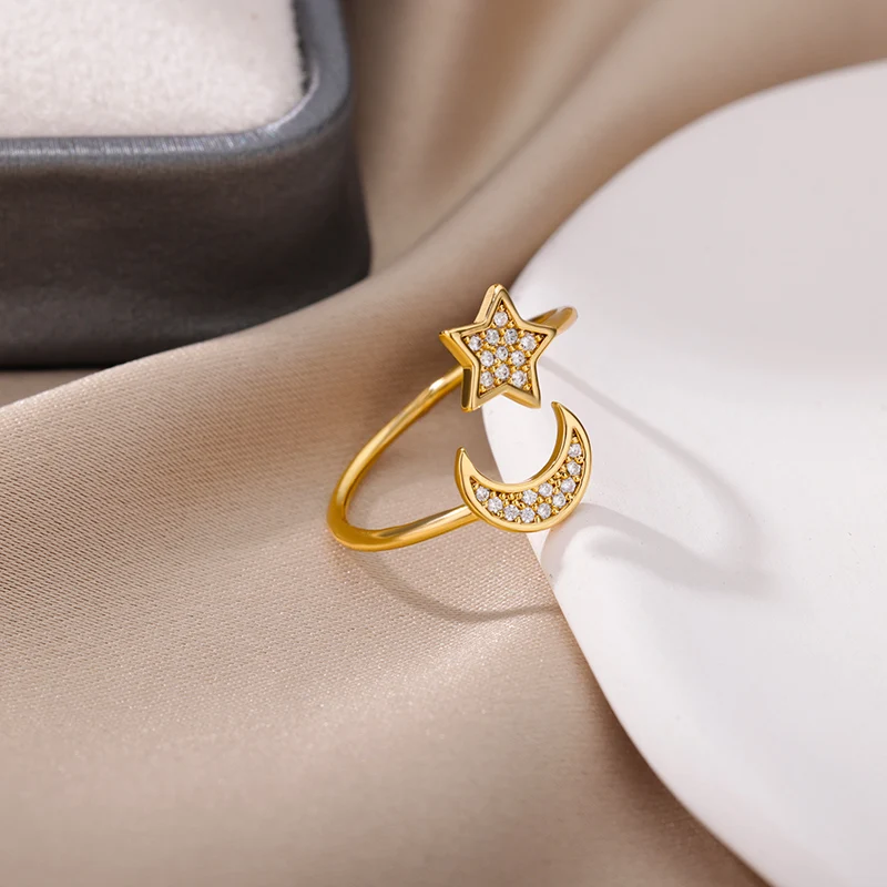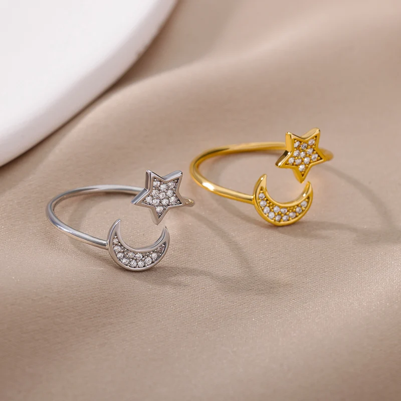 Moon Star Rings for Women Open Adjustable Stainless Steel Zircon Aesthetic Ring 2023 Trend Couple Wedding Jewelry anillos mujer
