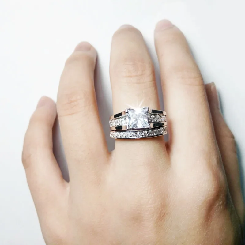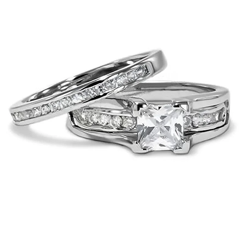 Princess Cut Cubic Zirconia Couple Rings Stainless Steel Wedding Ring Set for Women and Men
