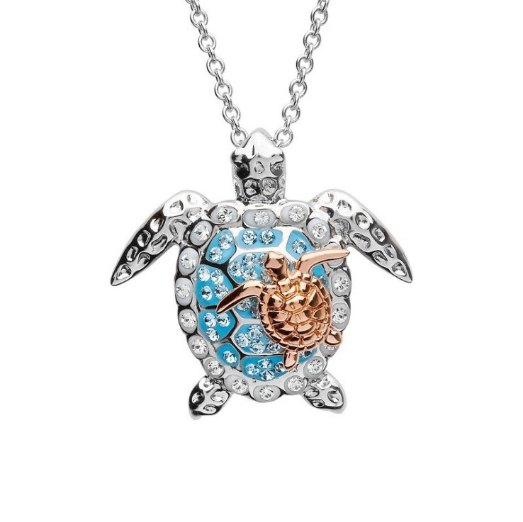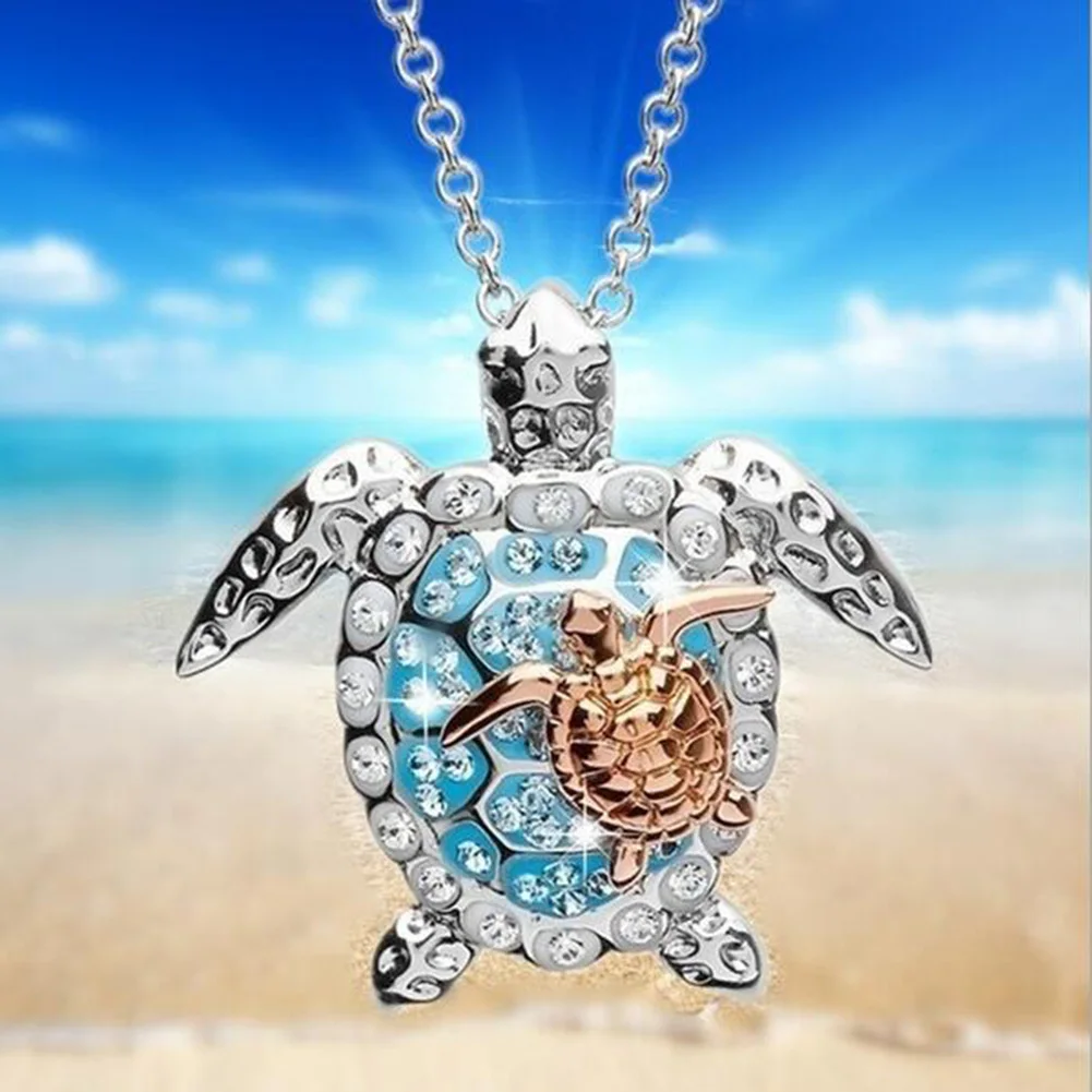 Turtle Pendant Necklace Blue Rhinestone Crystal Sea Ocean Cute Animal Stainless Steel Woman Engagement Jewelry 2021