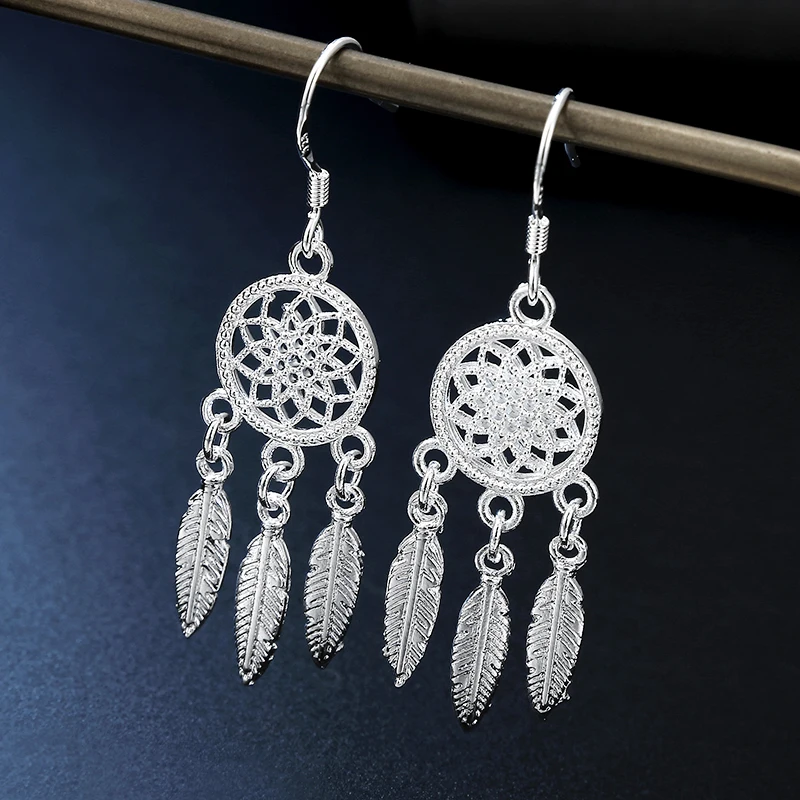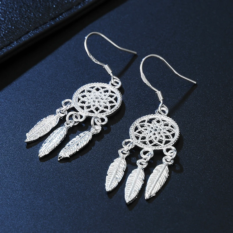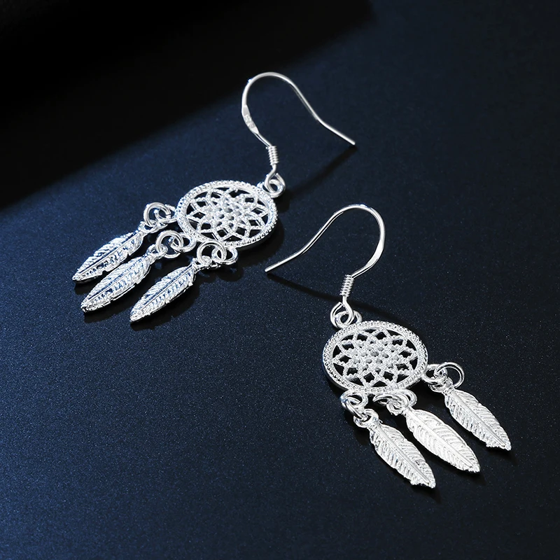 Women's 925 Stamp Silver Color Feather Hanging Earrings Hollow Circle Earring Wedding Jewelry Christmas GaaBou