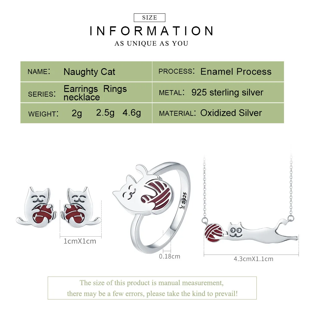 100% 925 Sterling Silver Set Naughty Little Cat Necklace Earrings Ring Jewelry Sets Sterling Silver Jewelry Gift ZHS046