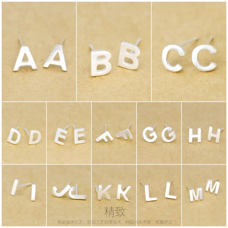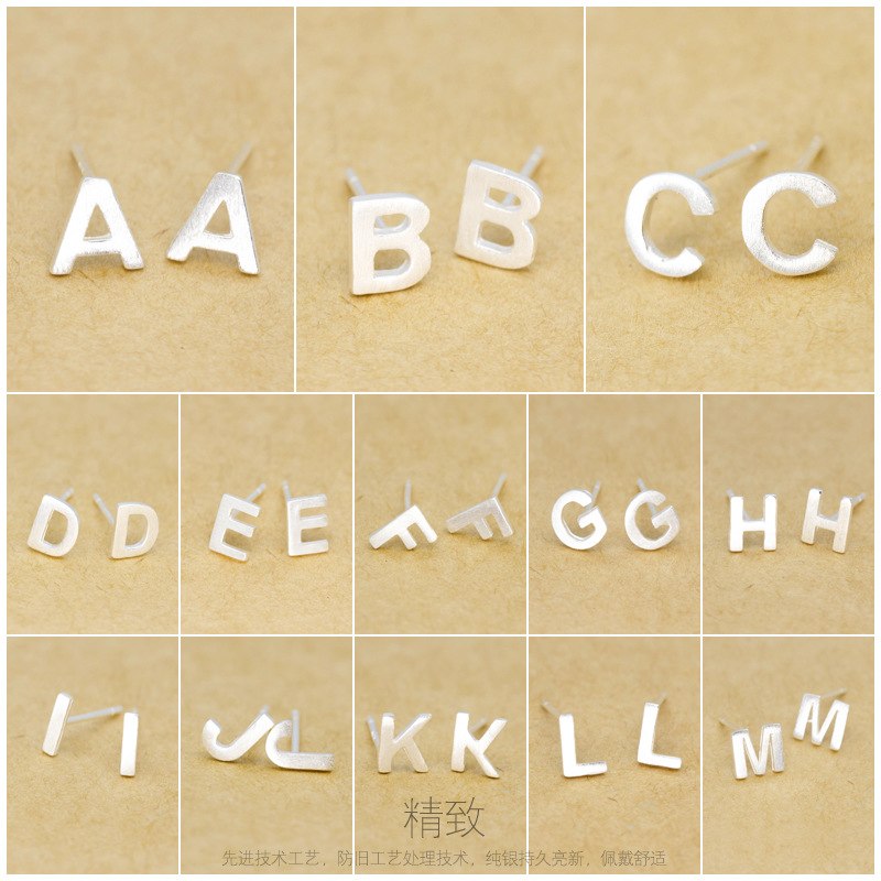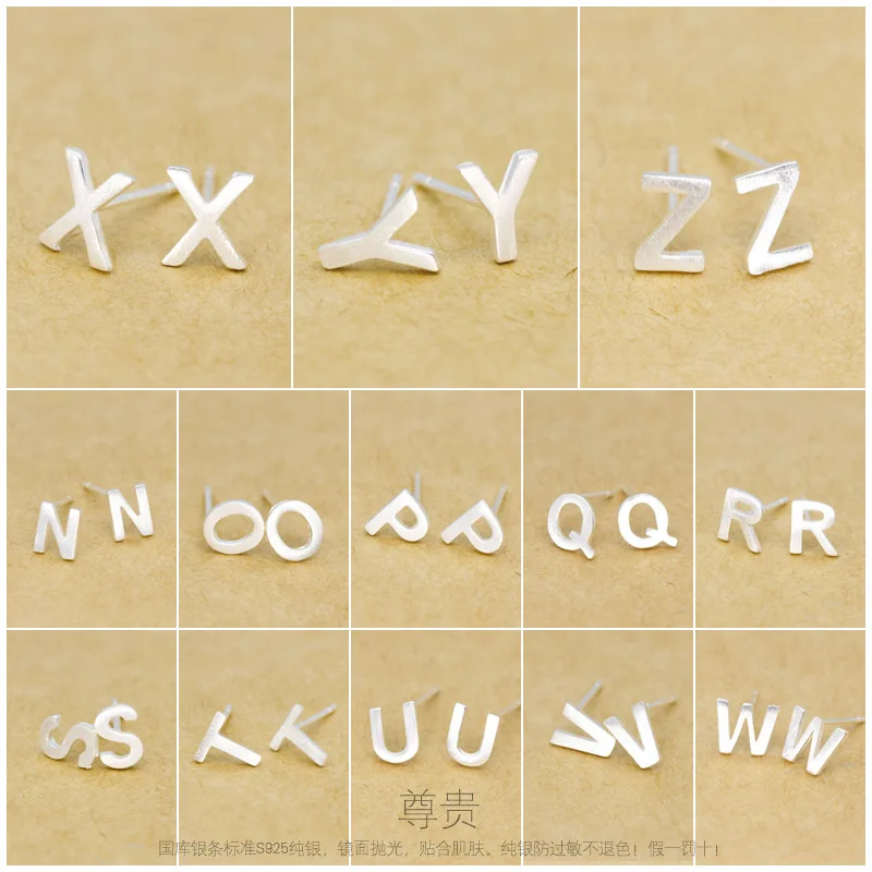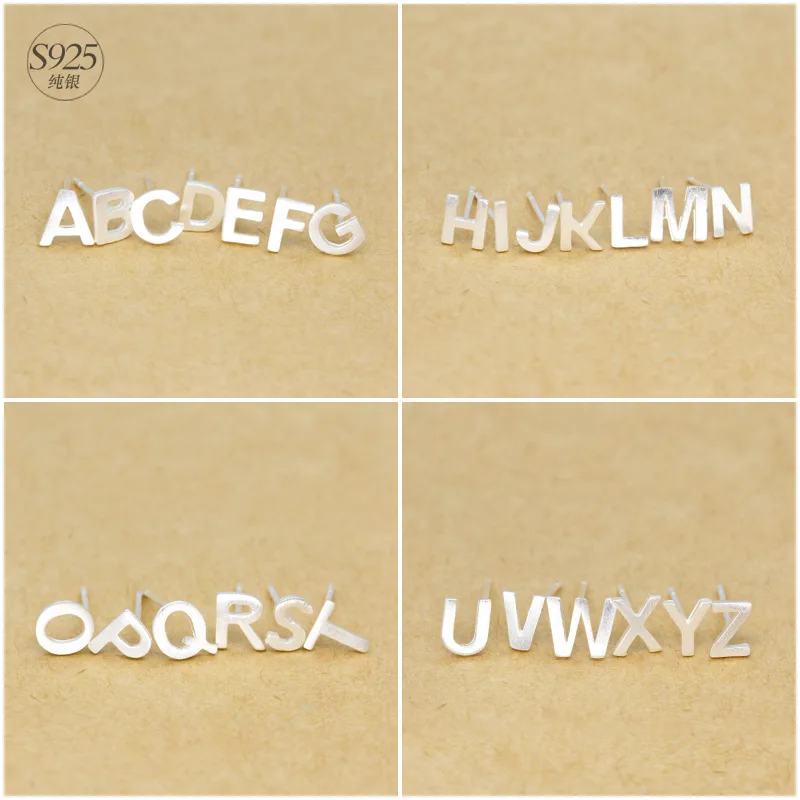 1pair 100% Genuine 925 Sterling Silver Matte 26 letters alphabet Earrings Stud 1Pair Plain Nickel free comfortable GTLE258