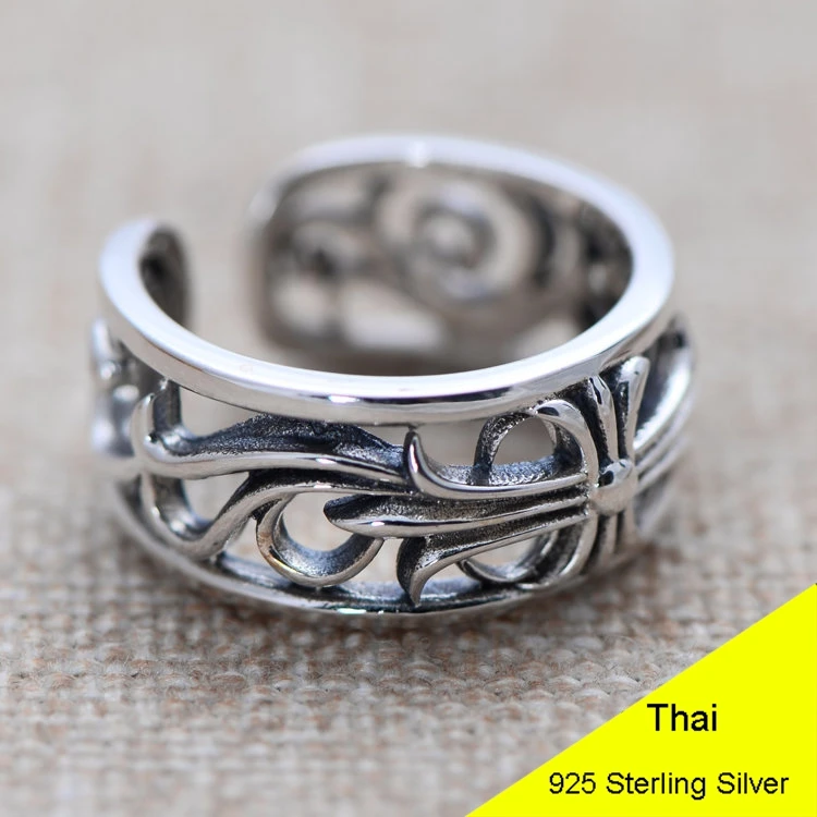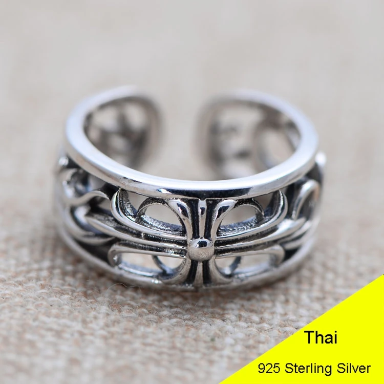 100% Genuine 925 Sterling Silver Hollow Cross Flower Open Ring Men Thai Silver Fine Jewelry Gift 1.0cm Wide Finger Ring CH048100