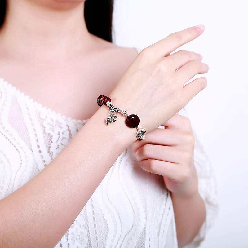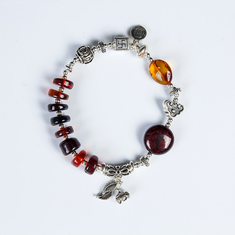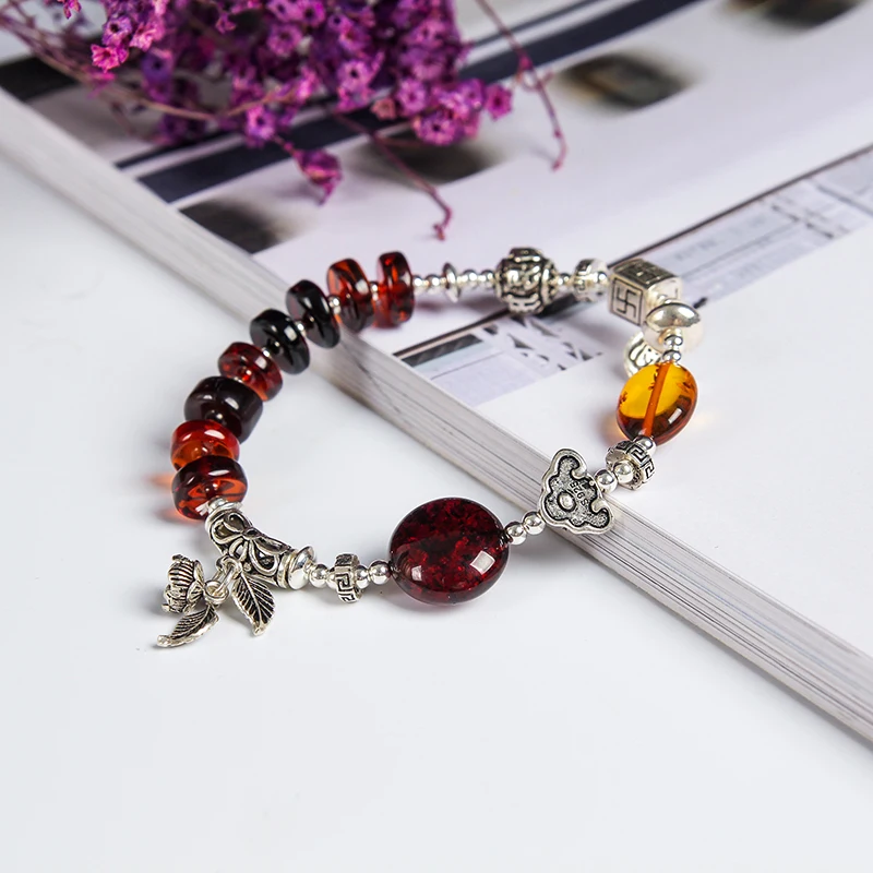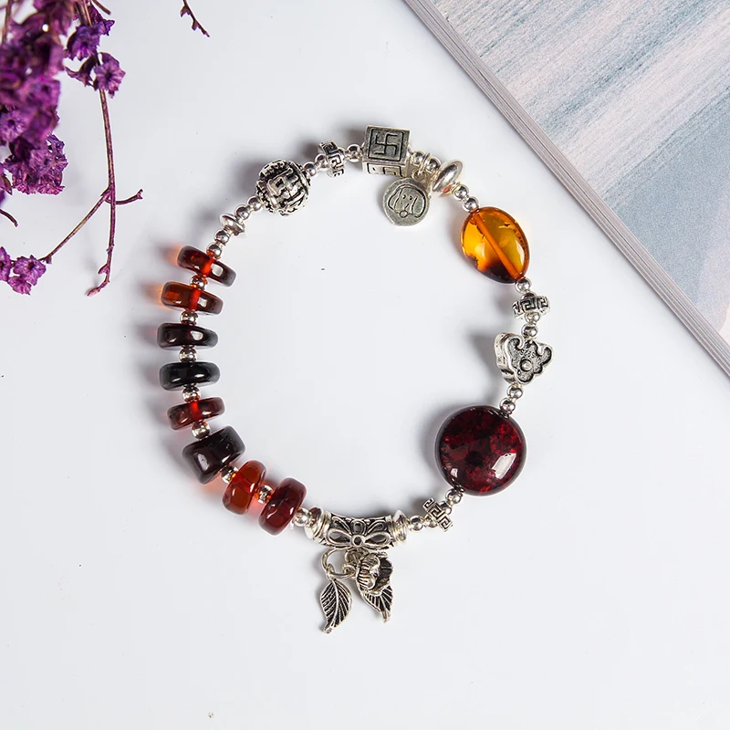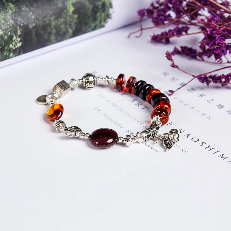 100% Natural amber beeswax multi-treasure hand string bracelet 925 sterling silver drop pendant lady genuine noble grade special