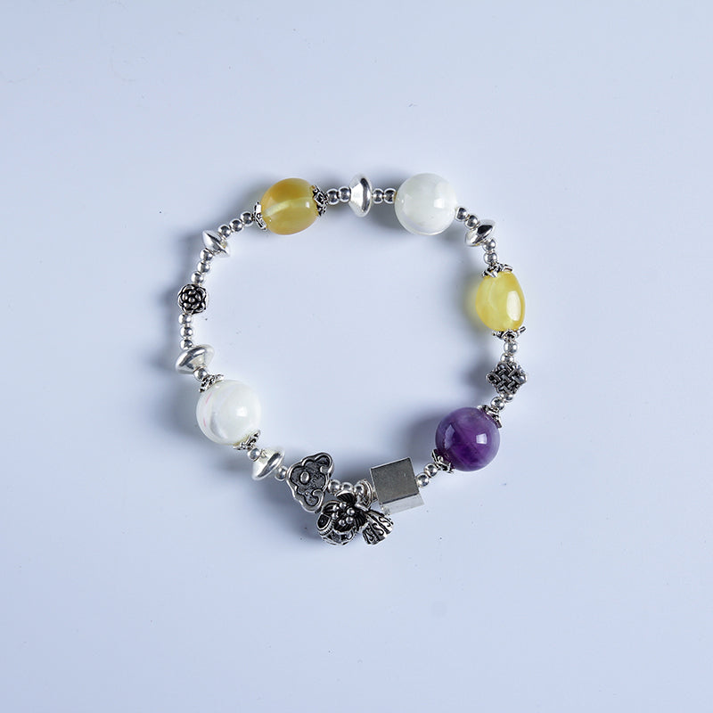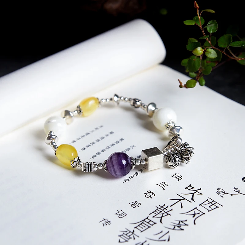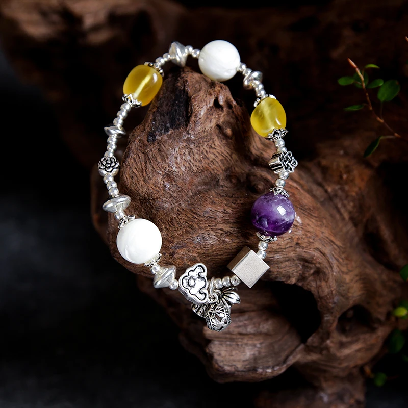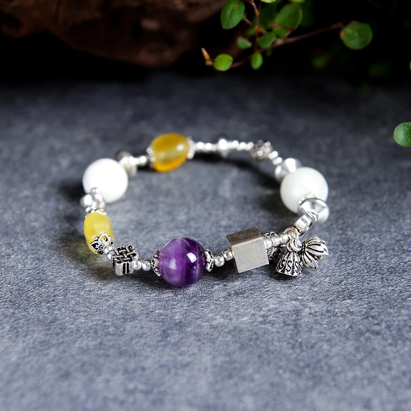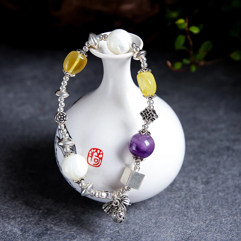 100% Natural amber beeswax multi-treasure hand string bracelet 999 sterling silver drop pendant lady genuine noble grade speci