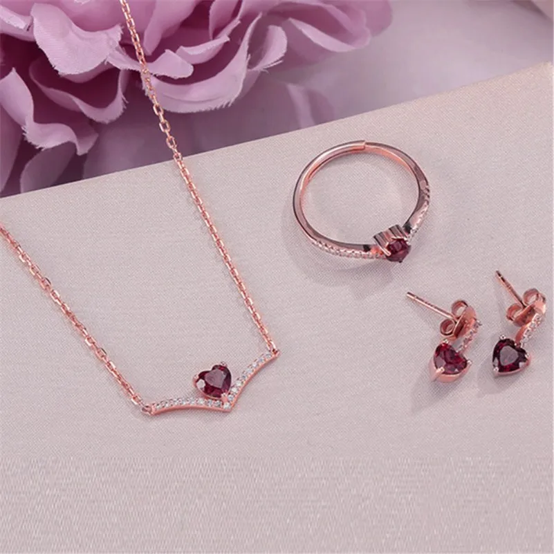 100% Natural Garnet Fine Jewelry Sets for Women 925 Silver Heart Love Red Gemstone Ring Necklace Bracelet Bijoux CCV004-1