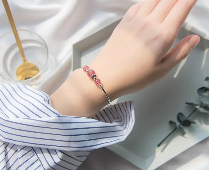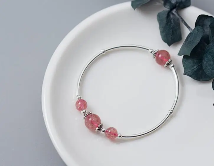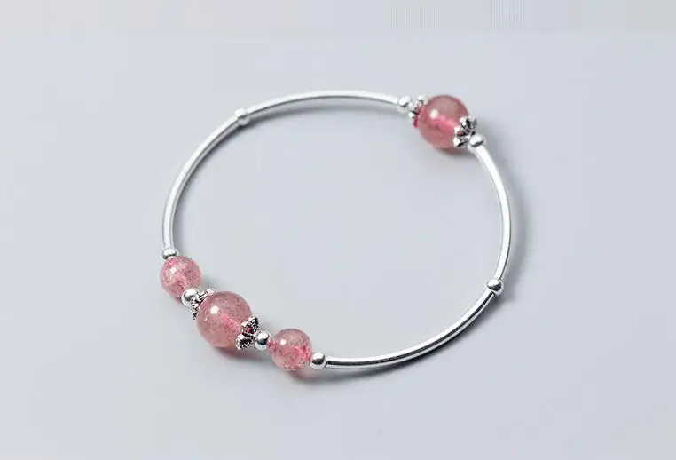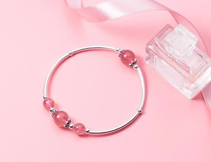 100% Real. 925 Sterling Silver Fine Jewelry Flowers&Beads Natural Rose Strawberry Quartz Stone Bracelet LS757