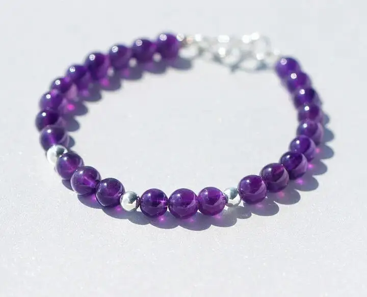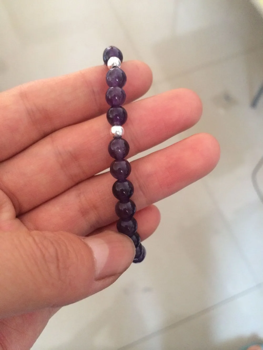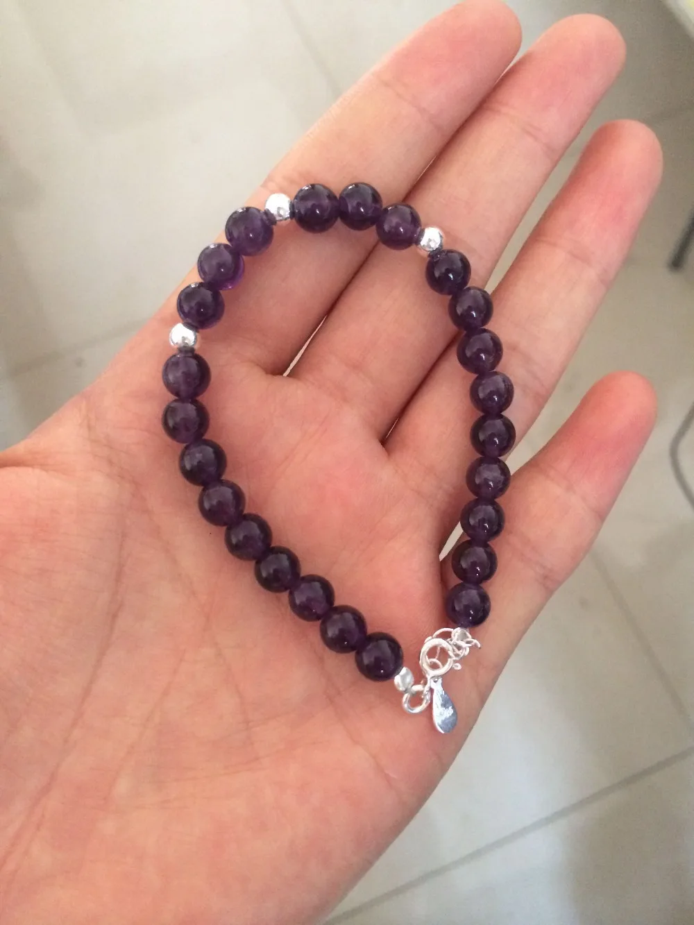 100% Real. 925 Sterling Silver Jewelry 6.5MM Natural Purple Amethyst Stone &Bead Bracelet Charms length 15.5cm GTLS404