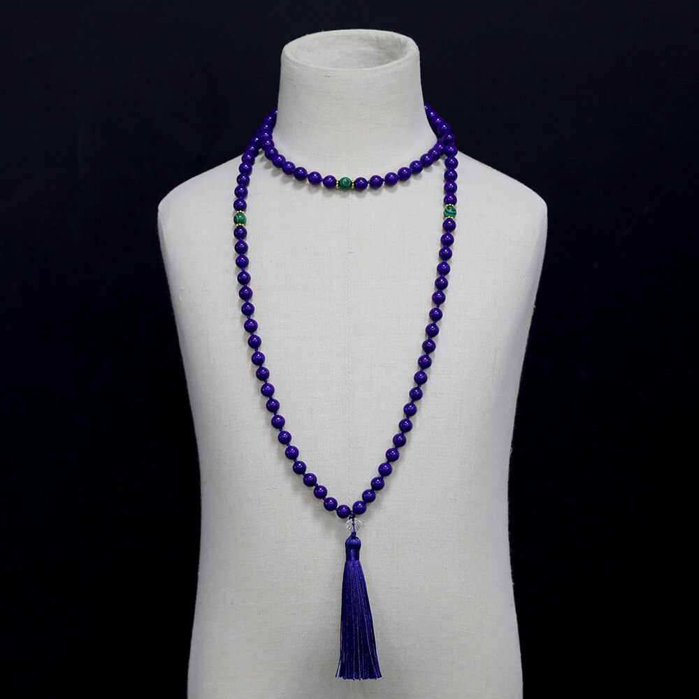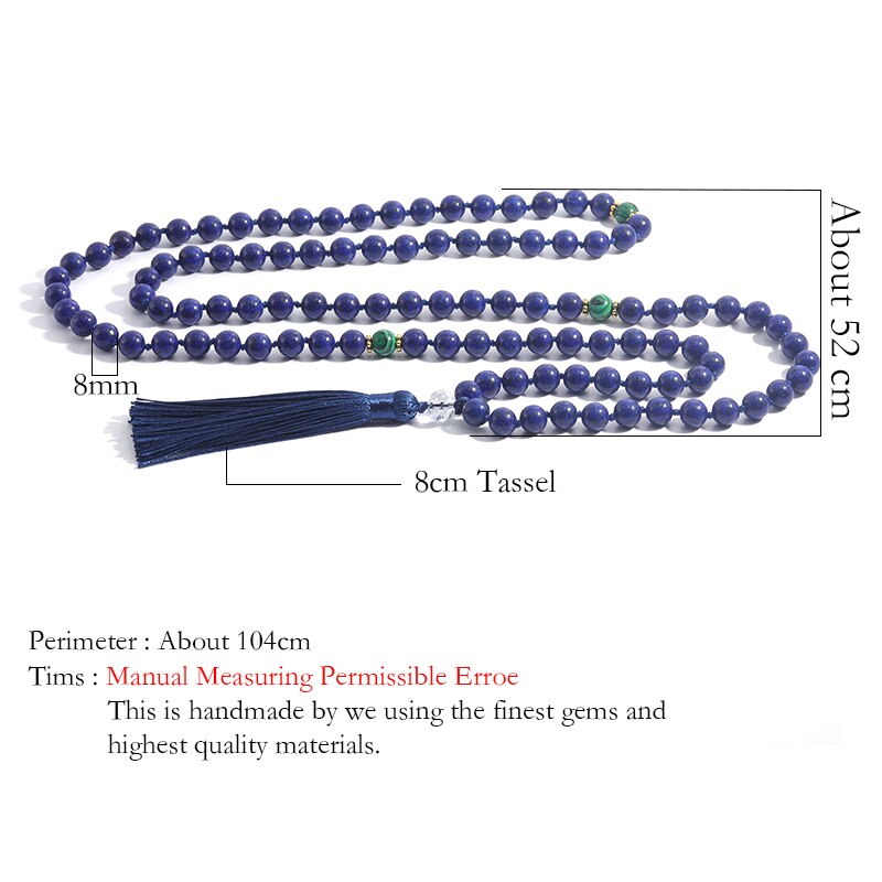 108 Mala 8MM Lapis Lazuli & Green Malachite Beaded Knotted Necklace Men and Women Blessing Charm Jewelry Long Tassel