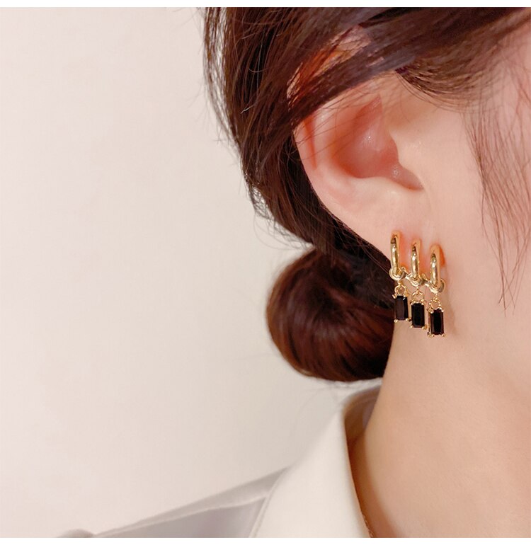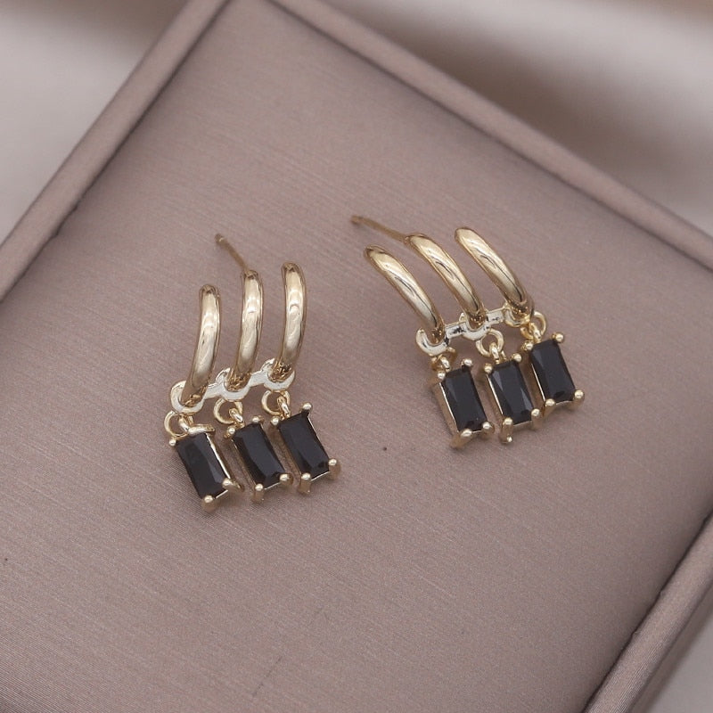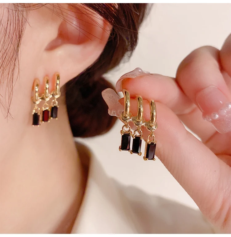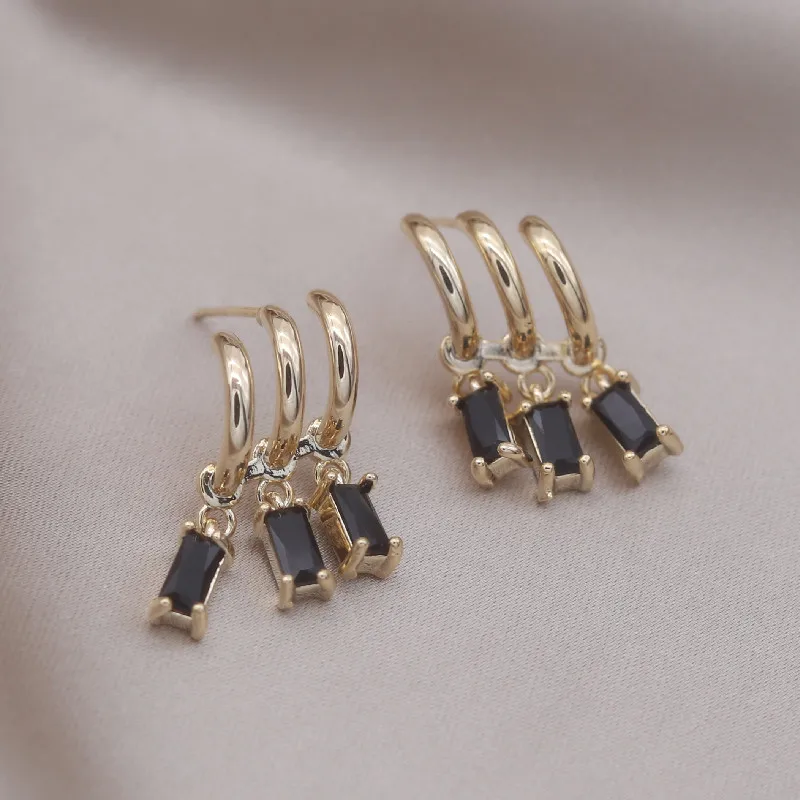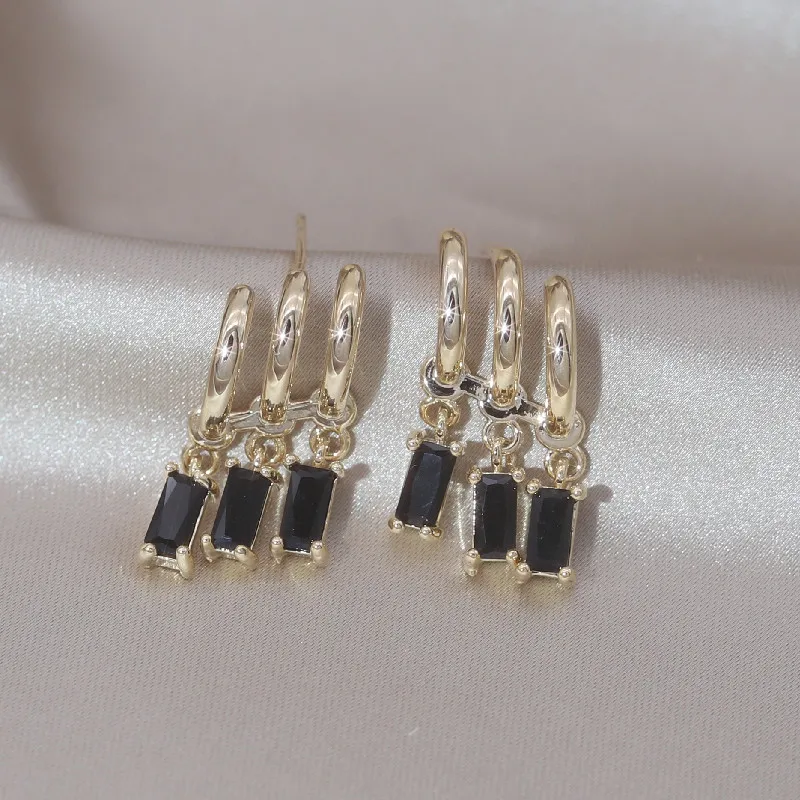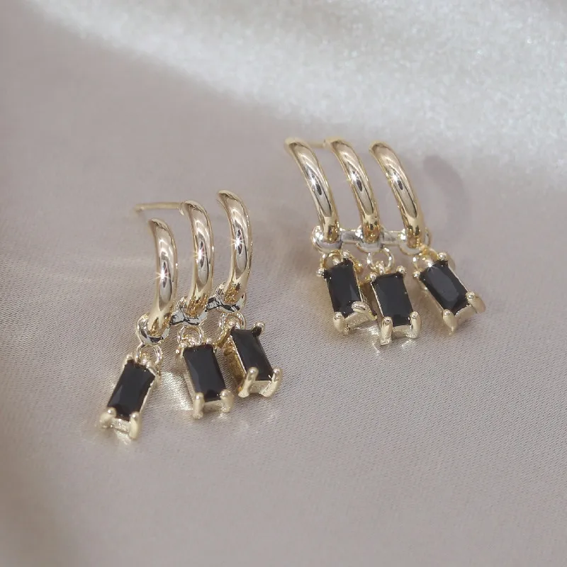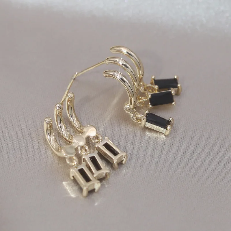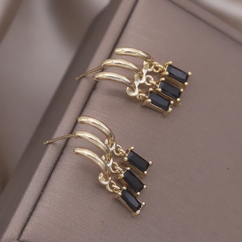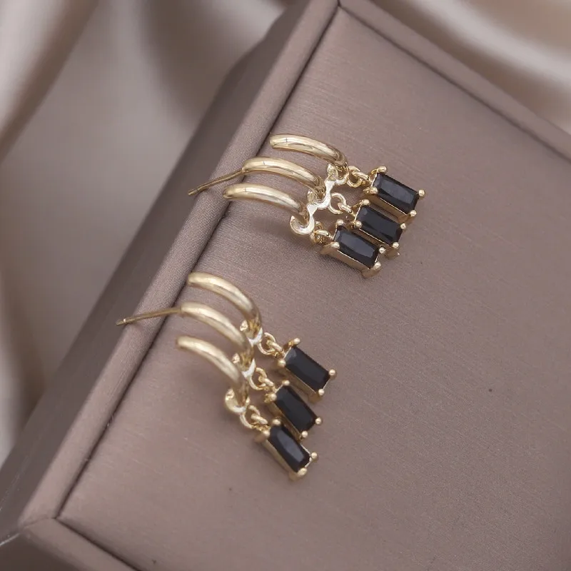 14K Gold Plated Korea Design Jewelry Three Layers Tassel Black Zircon Earring Elegant Women's Daily Work Accessories