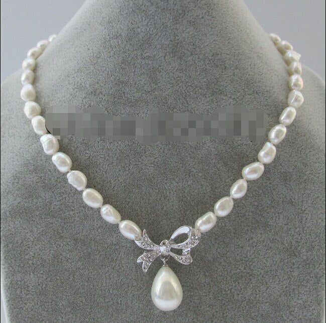 17 " 9-12mm white baroque freshwater pearl necklace + butterfly 20mm shell pearl