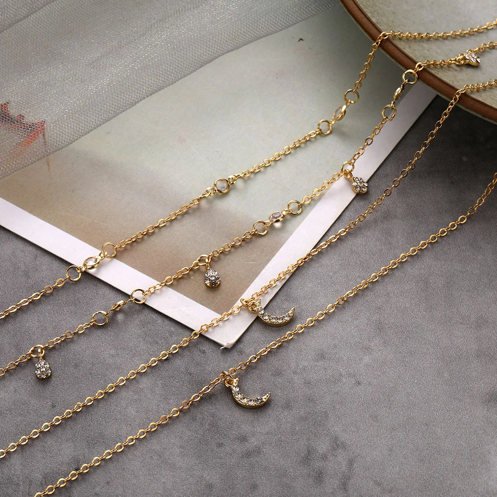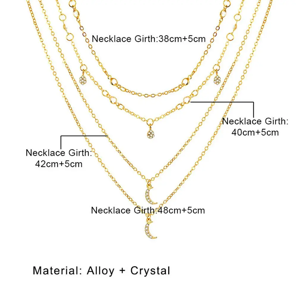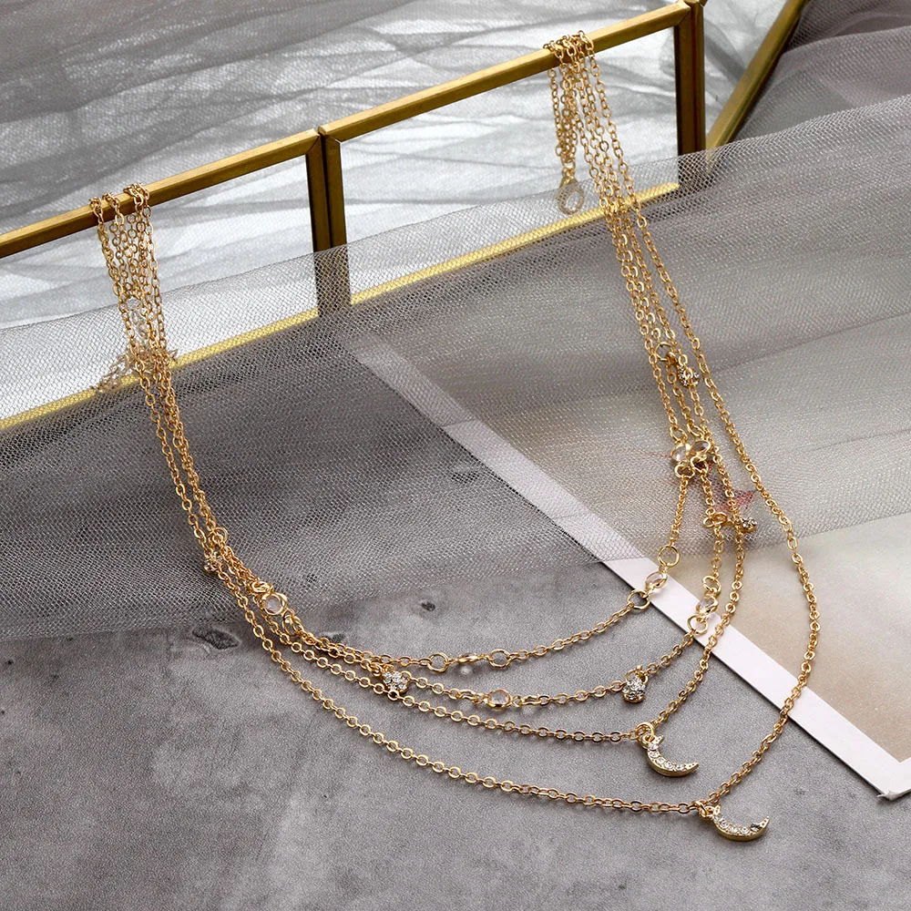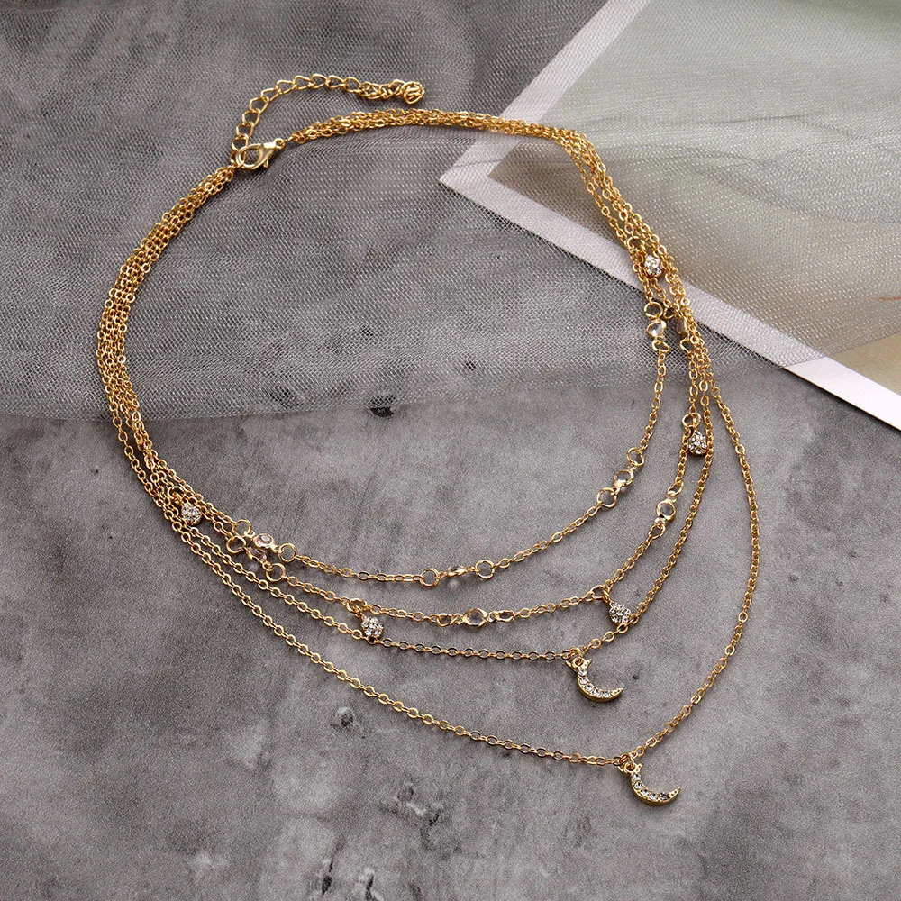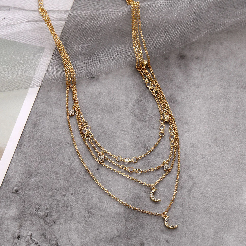 1pc Vintage Gold Necklace For Women Multilayer Chain Crystal Moon Pendant Charm Necklace Ethnic Choker Anniversary Party Jewelry