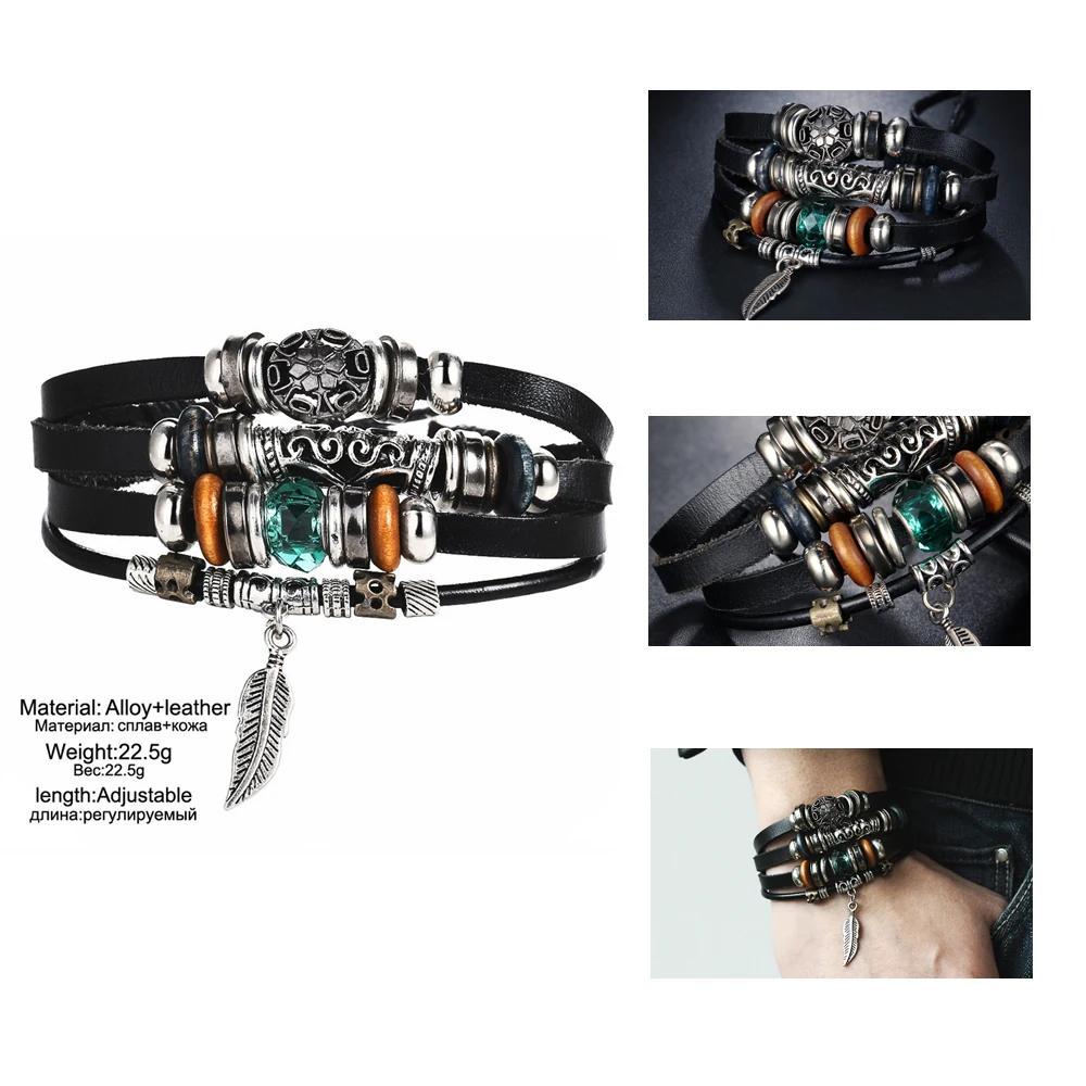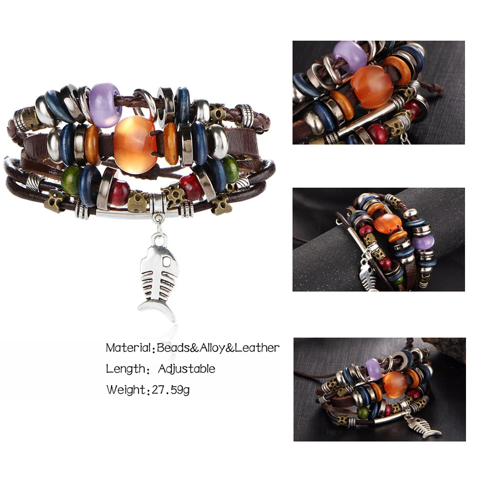 BOHO Tibet Stone Feather Leather Bracelet Eye Fish Charms Beads Bracelets for Men Vintage Punk Wrap Wristband