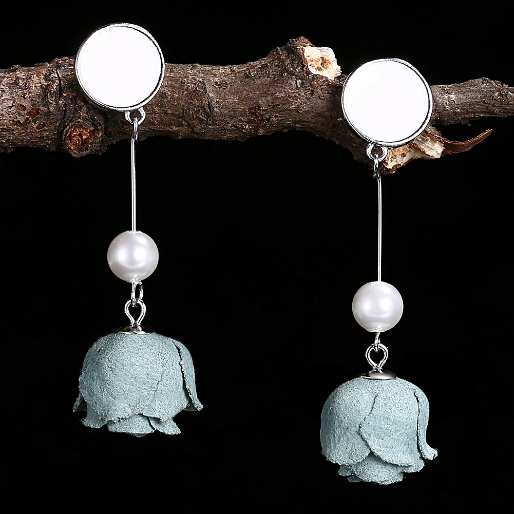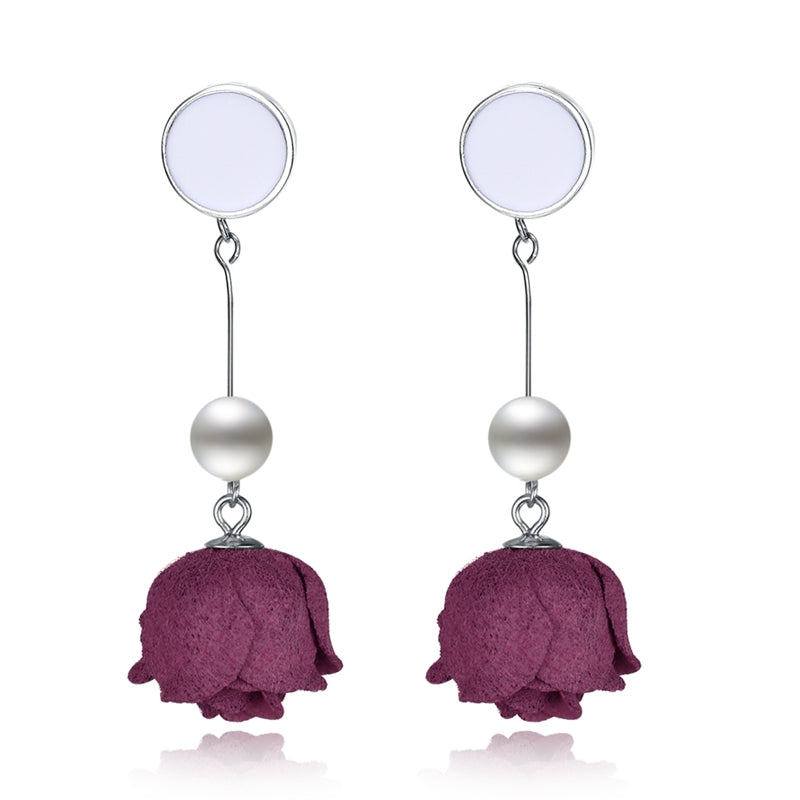 2020 New Fashion Earrings White Pearls Gr Fabric Rose Flower 925 Sterling Silver Drop Earrings Girl Long Earring Jewelry