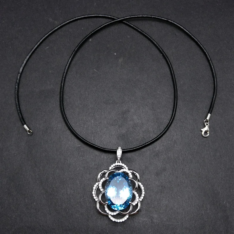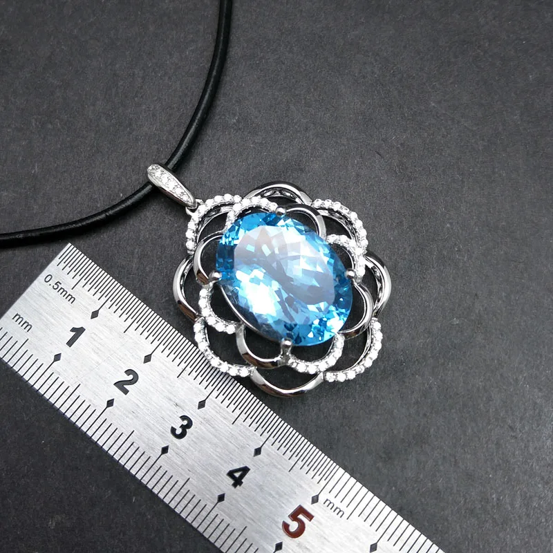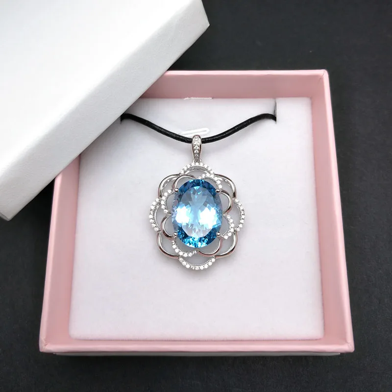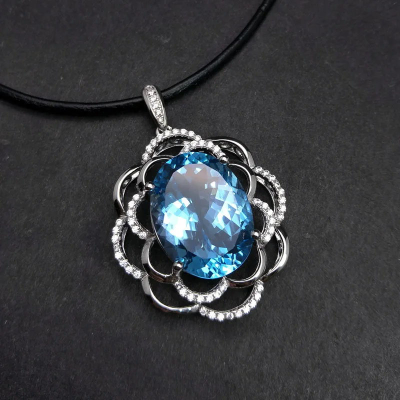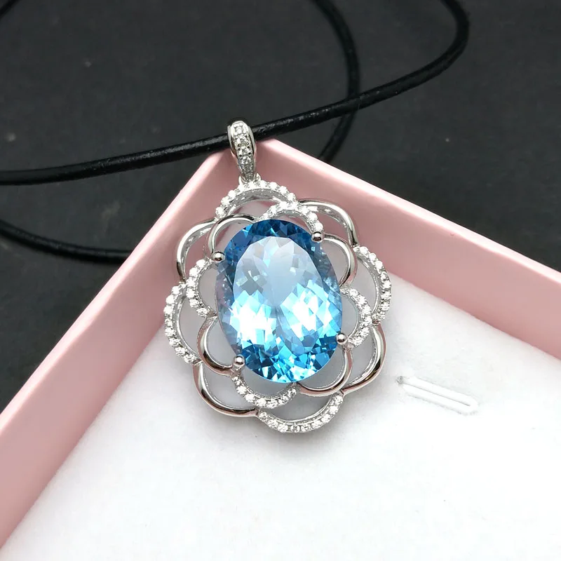 2020 new Shinning 21ct Natural stone Sky Blue Topaz Pendant leather chord necklace 925 Silver fine Jewelry for women best gift